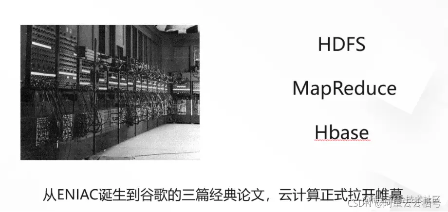 自世界上第一台通用计算机 ENIAC (图左)诞生以来,计算机科学与技术的发展就从未停止过前进的脚步。2003年-2006年,谷歌先后发表了这三篇非常经典的论文(图右),指明了HDFS(分布式文件系统)、MapReduce(并行计算)和HBase(分布式数据库)的技术基础及未来机会,为云计算发展方向奠定了基础。