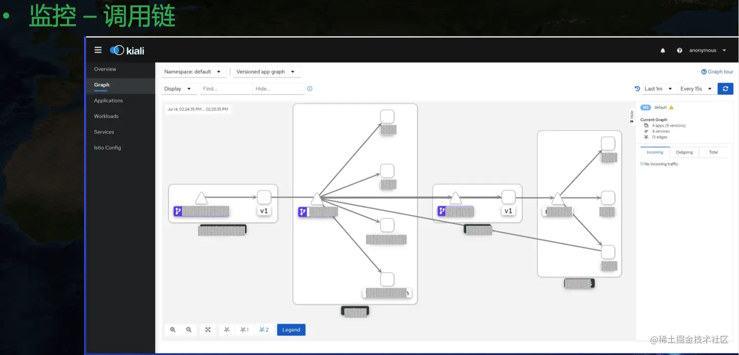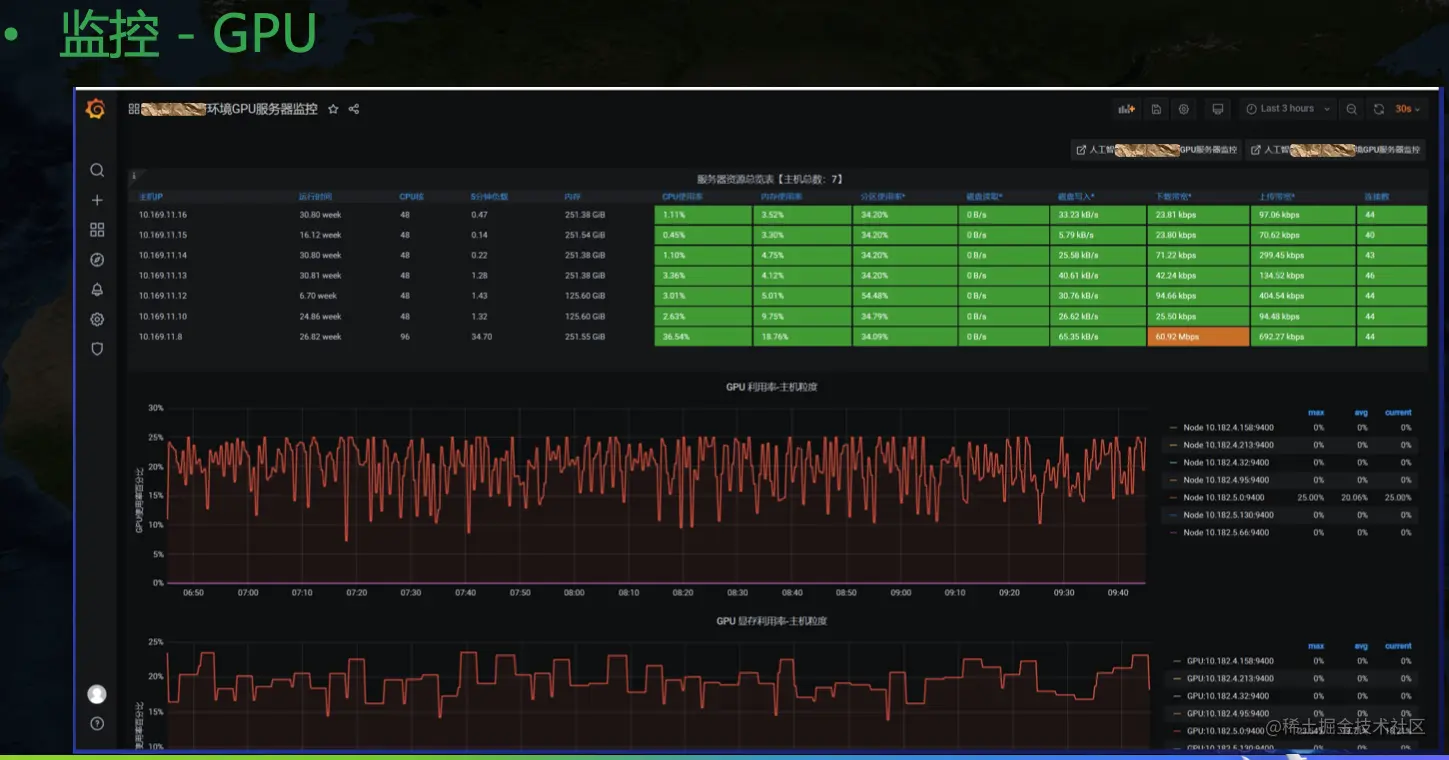目前 grafana 社区并没有一个合适的 GPU 纬度展示模板,NVIDIA 也只给了一个主机纬度的相对粗糙的 Dashboard。目前我们用的 GPU Dashboard 是自己开发的。还有一个调用链纬度的监控: