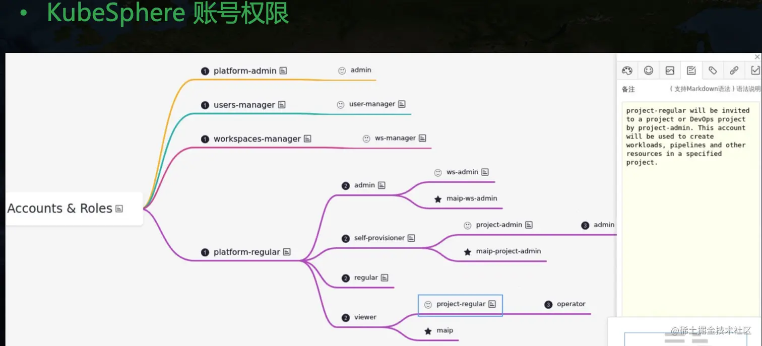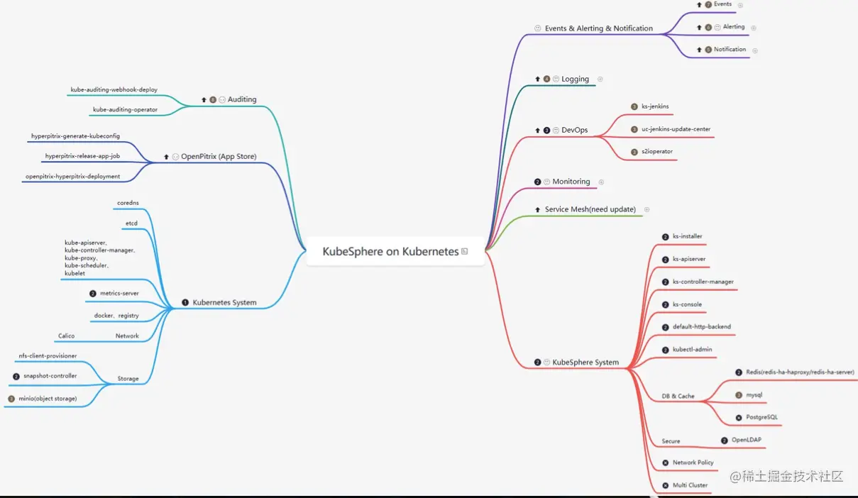 KubeSphere 里组件不少,面对这样一个复杂软件,我的方式是通过思维导图来梳理里面的所有组件,然后最小化部署,看下集群里有些啥,然后可插拔组件一个个开启,看下多了哪些组件,这样一个个模块去梳理,最终实现对整个平台架构整体掌握的目的: