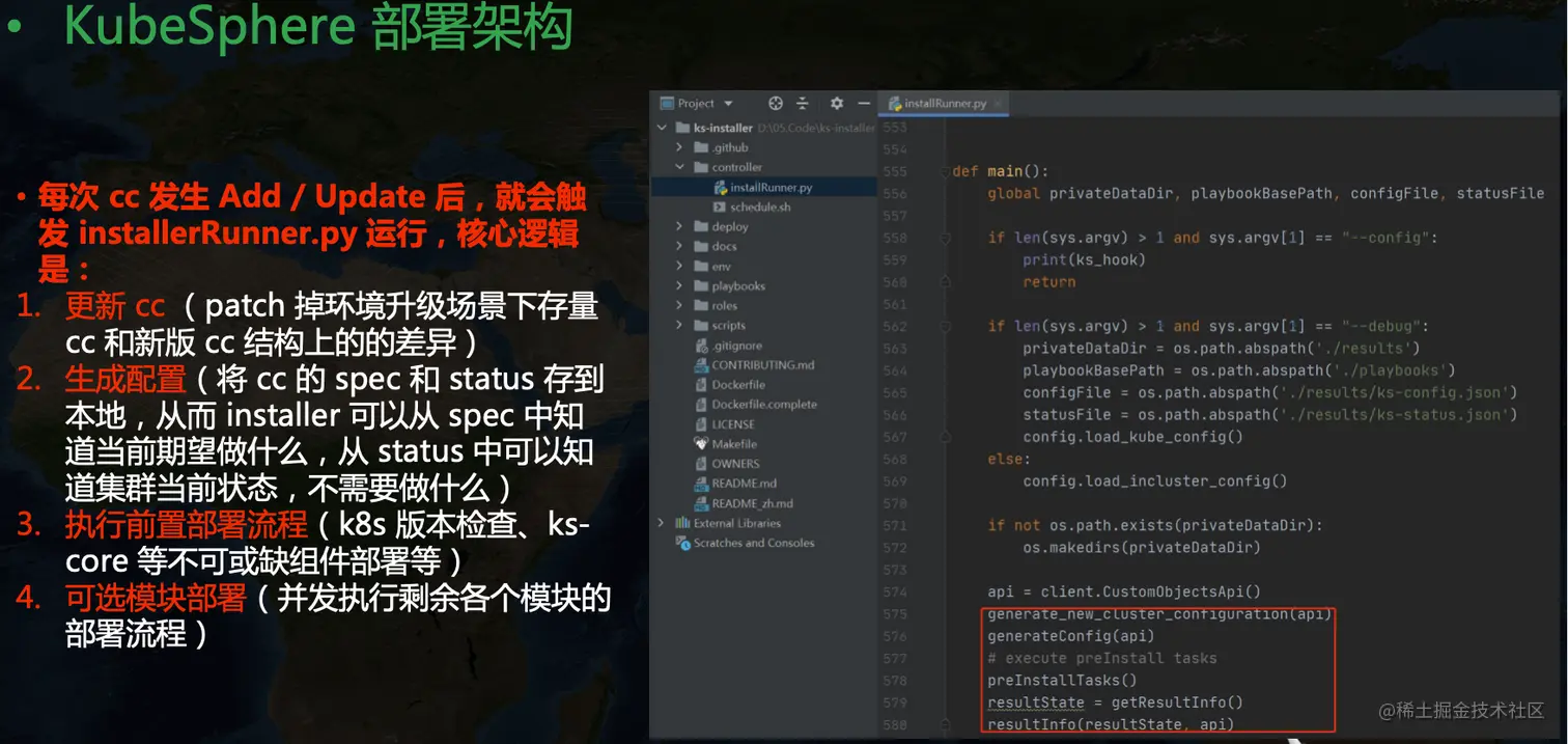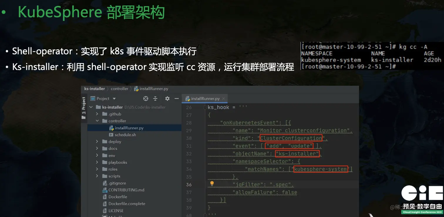 在 KubeSphere 里可以看到一个叫做 kubesphere-system/ks-installer 的资源,简写 cc,全称是 ClusterConfiguration,里面维护了集群的配置信息。我们在 ks-installer 里可以看到一个 ks-hook 配置,里面定义了 kind ClusterConfiguration,event add update,objectName ks-install,namespace kubesphere-system 等信息,这里也就是告诉 shell-operator 当 cc 发生变更的时候要触发相关代码执行。ks-installer 的核心原理是利用 shell-operator 来监听 cc 资源的变更,然后运行集群部署流程。