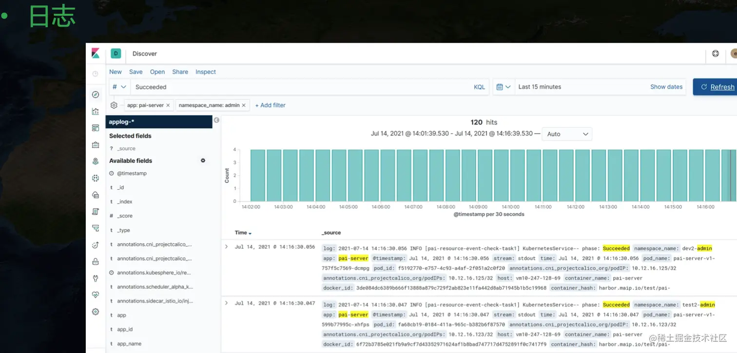日志这里可以看到一个额外的信息,我们可以根据 app 纬度来聚合,也就是一个应用下的不同 Pod 产生的日志可以汇总展示。这里其实是简单地根据 pod 的 label 来实现的,将每个 Pod 打上应用相关的 label 信息,然后采集日志时将这个属性暴露出来,就能在展示时针对性汇总。在中台发布的应用有一个日志跳转按钮,转到 kibana 页面后会带上相关参数,实现该应用下全部日志聚合展示的功能。