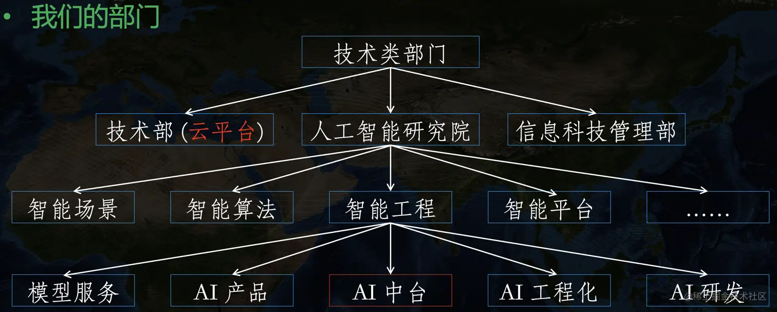 可以看到 AI 中台团队隶属于“人工智能研究院”大部门下,与负责“云平台”的技术部中间有一个很高的部门墙。也因此,AI 中台所需要的底层云计算相关技术并不能很好的依赖于技术部,两边有不同的考核机制、目标、痛点,所以 AI 中台团队需要自己搭建底层云平台,这也是我们引入 KubeSphere 的一个重要原因。