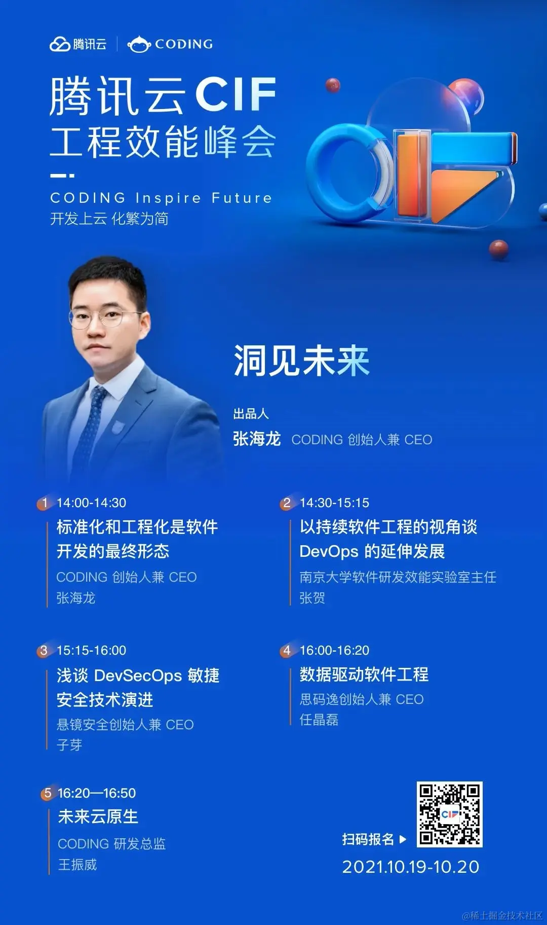 理解云原生之后,那么云原生正在朝着怎样的方向发展,未来将如何演进?软件开发的下一个十年将会是怎样的面貌?软件开发最终会演变成怎样的形态?在 10 月 20 日线上召开的腾讯云 CIF 工程效能峰会 - 洞见未来论坛上,CODING 创始人兼 CEO 张海龙、南京大学软件研发效能实验室主任张贺、 悬镜安全创始人兼 CEO 子芽、思码逸创始人兼 CEO 任晶磊、CODING 研发总监王振威将为大家带来他们对云原生、DevOps、DevSecOps、软件工程等领域当下的思考与未来的展望。