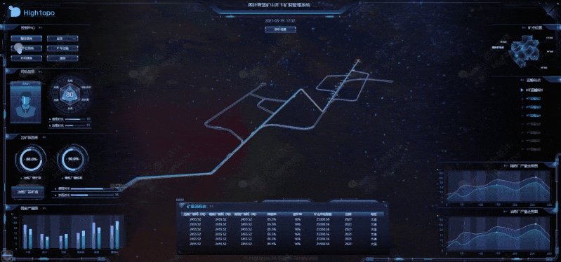 针对控制中心页面的建设,运用 HT 丰富的可视化图表和动画效果,集成供水、通风、运输、掘锚机运作及井内三维漫游画面,形象的对井下多元应用场景进行详尽的数据解释;可融合智能感知设备数据,实现对矿井的生产环境、工作视角、设备分布、工艺流程、产量走势、巷道划分、设备运行实时状态的真实复现,达到矿井上下透明化管理的目的。