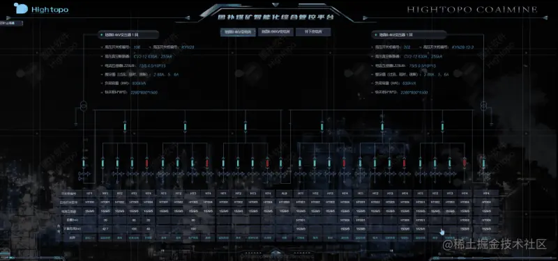 结合 HT 产品 Web 2D 组态功能,再通过数据采集,实现供配电系统可视化,“一张图”式切换矿井上下变电所的设备状态参数显示、电量计量、峰谷电能计量及能耗统计分析等数据。完善了现场无人值守成效和对井上井下供电系统的遥测、遥信、遥控、遥调、遥视信息功能的全方位监控。