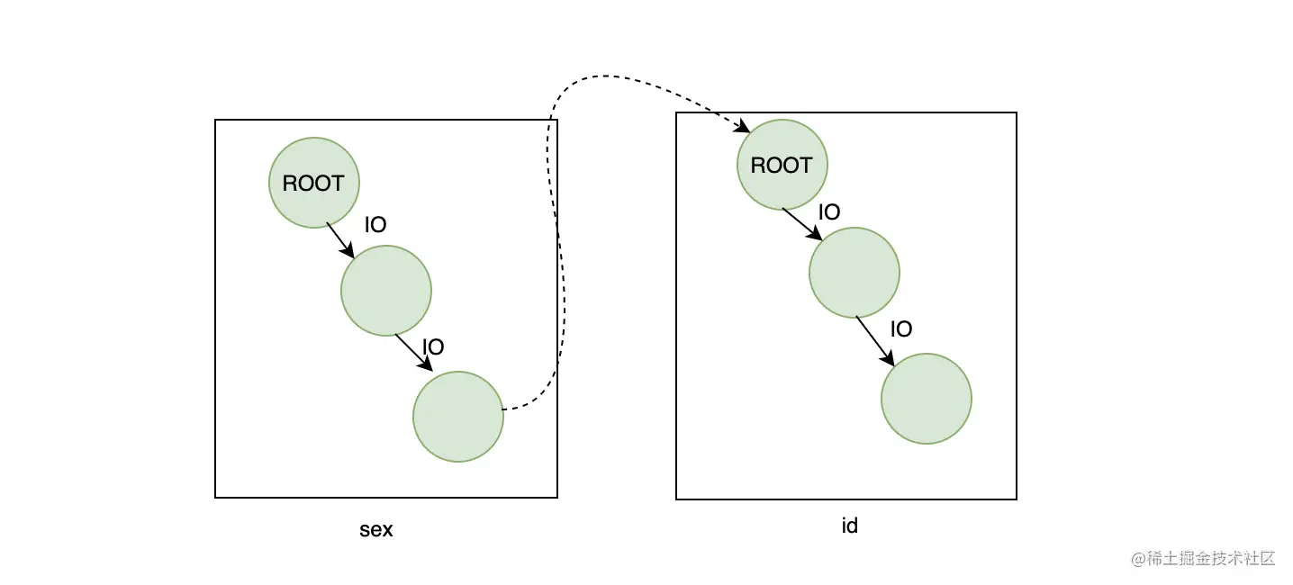 从效果上来看,结果是没问题的,但是从效率上来看,似乎这个查询有点昂贵,因为它检索了两颗B+树,假设一颗树的高度是3,那么两颗树的高度就是6,因为根节点在内存里(此处两个根节点),所以最终要在磁盘上进行IO的次数是4次,以一次磁盘随机IO的时间平均耗时是10ms来说,那么最终就需要40ms。这个数字一般,不算快。