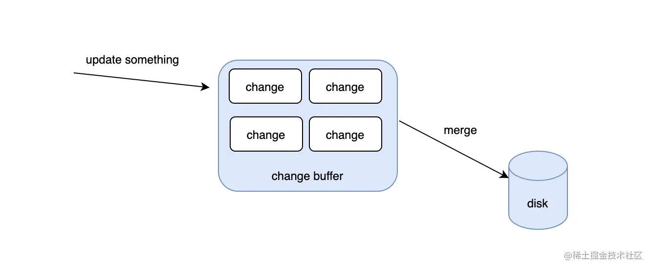 为了解决这种情况下的速度问题,change buffer出现了,首先不要被buffer这个单词误导,change buffer除了会在公共的buffer pool里之外,也是会持久化到磁盘的。当有了change buffer之后,我们更新的过程中,如果发现对应的数据页不在内存里的话,也不去磁盘读取相应的数据页了,而是把要更新的数据放入到change buffer中,那change buffer的数据何时被同步到磁盘上去?如果此时发生读动作怎么办?首先后台有个线程会定期把change buffer的数据同步到磁盘上去的,如果线程还没来得及同步,但是又发生了读操作,那么也会触发把change buffer的数据merge到磁盘的事件。