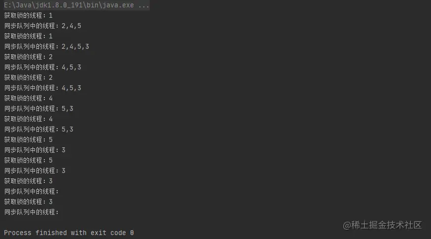 同步队列中等待的线程的顺序为2、3、4、5此时输出的结果为1、2、3、4、5和 1、2、3、4、5,按照同步队列中等待的顺序顺序输出,先进入同步队列的先获取到锁。