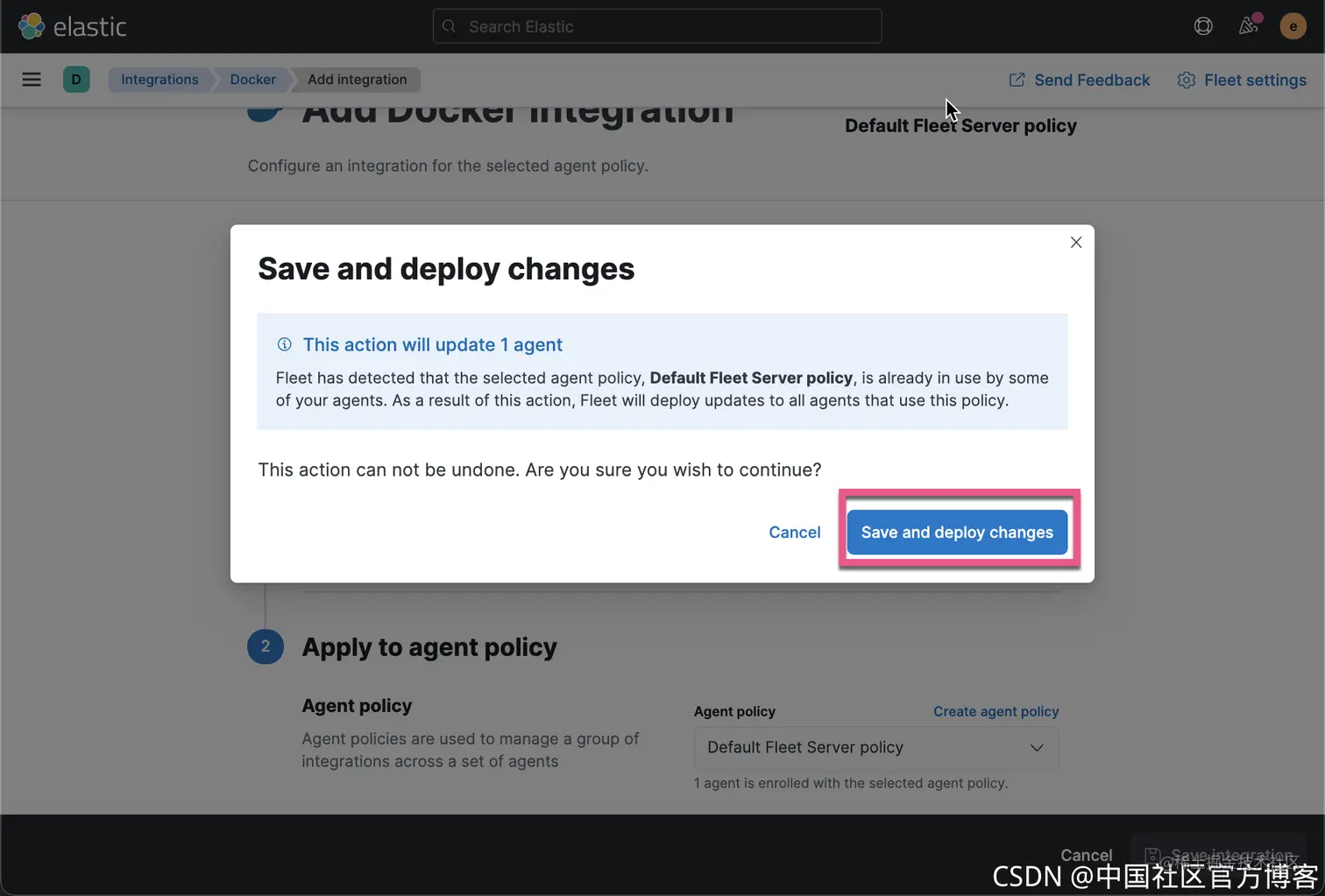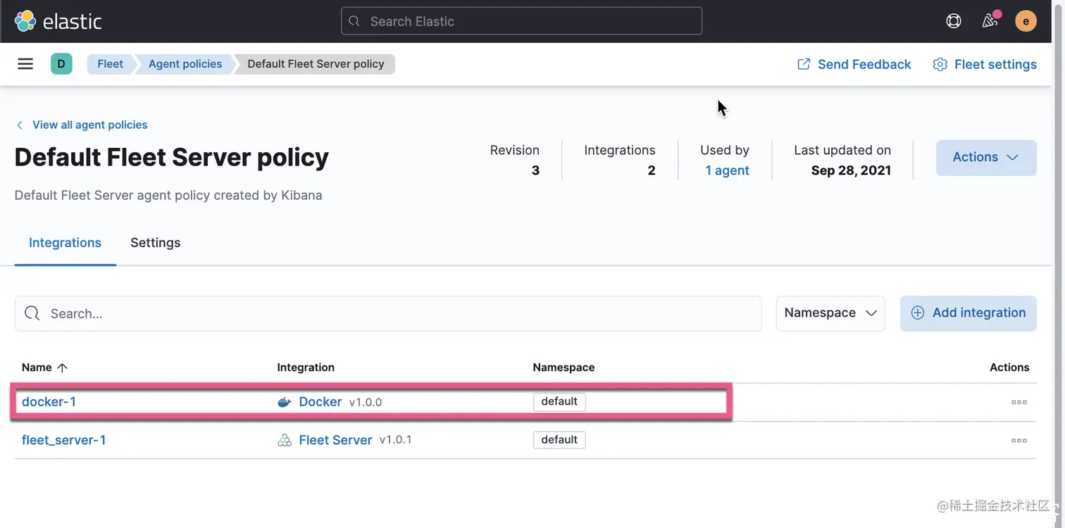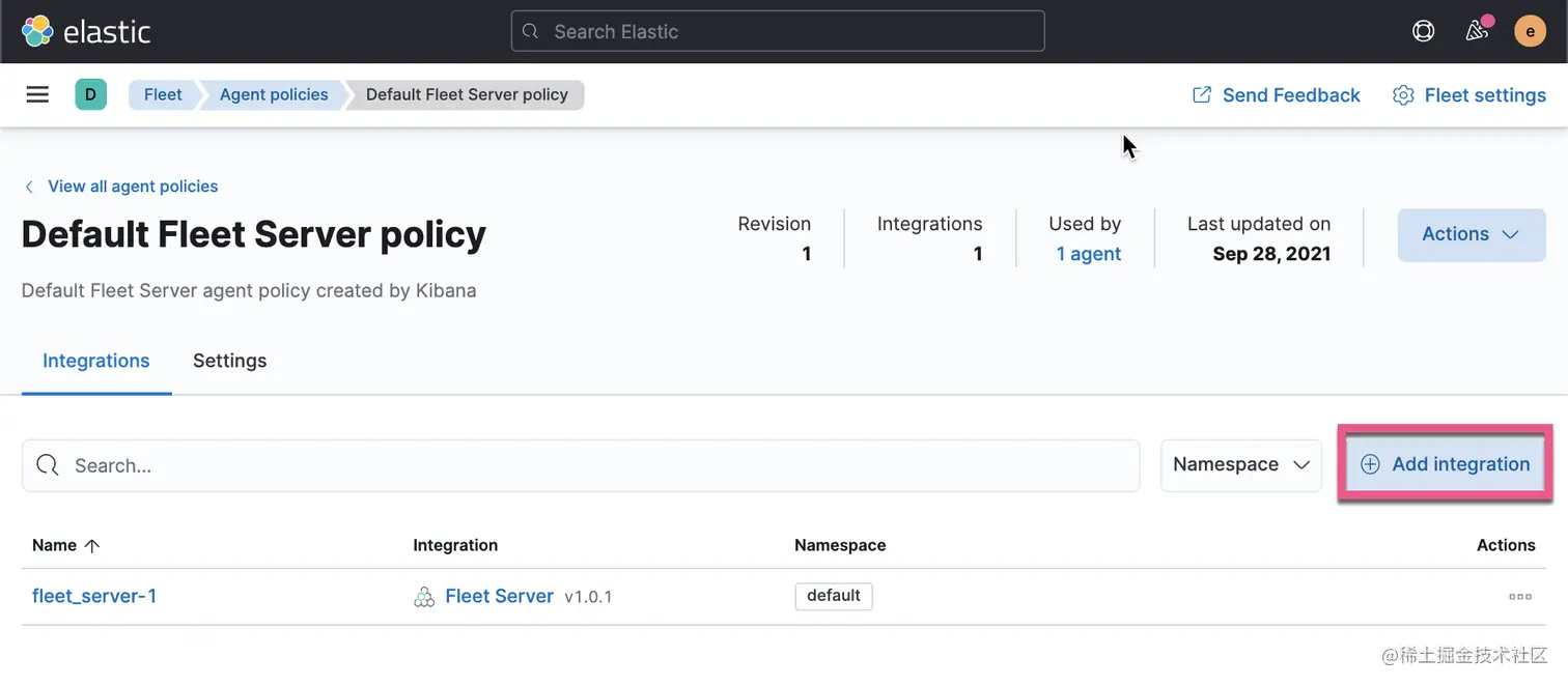 接下来。我们想为我们的 policy 添加一些新的 integration,比如我们想得到 docker container 的一些指标。我们点击如下的这个 Default Fleet Server policy: