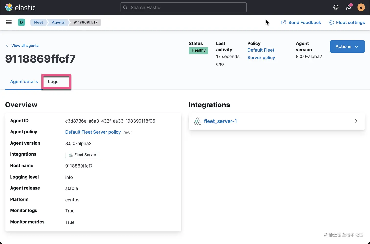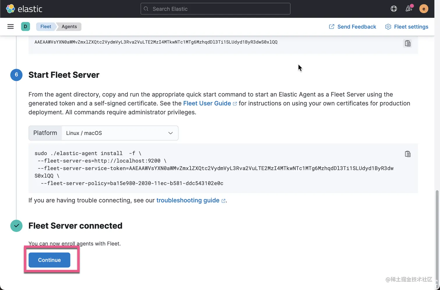 如上所示,我们可以看到 Fleet Server 已经被成功安装了。