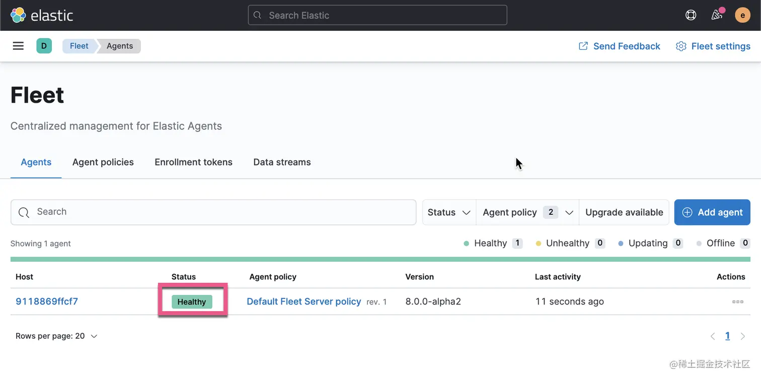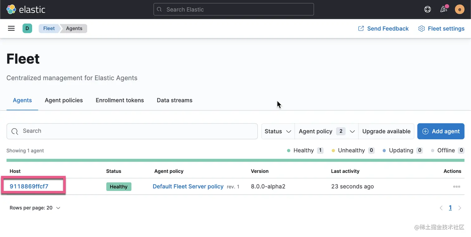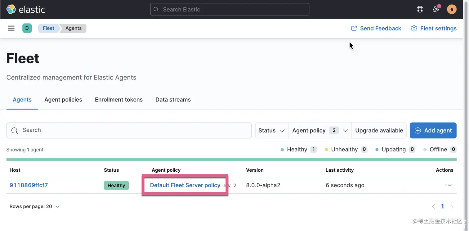 我们可以看到在 Fleet 页面看到一个状态为 Healthy 的 agent。它目前使用的是 Default Fleet Server Policy。