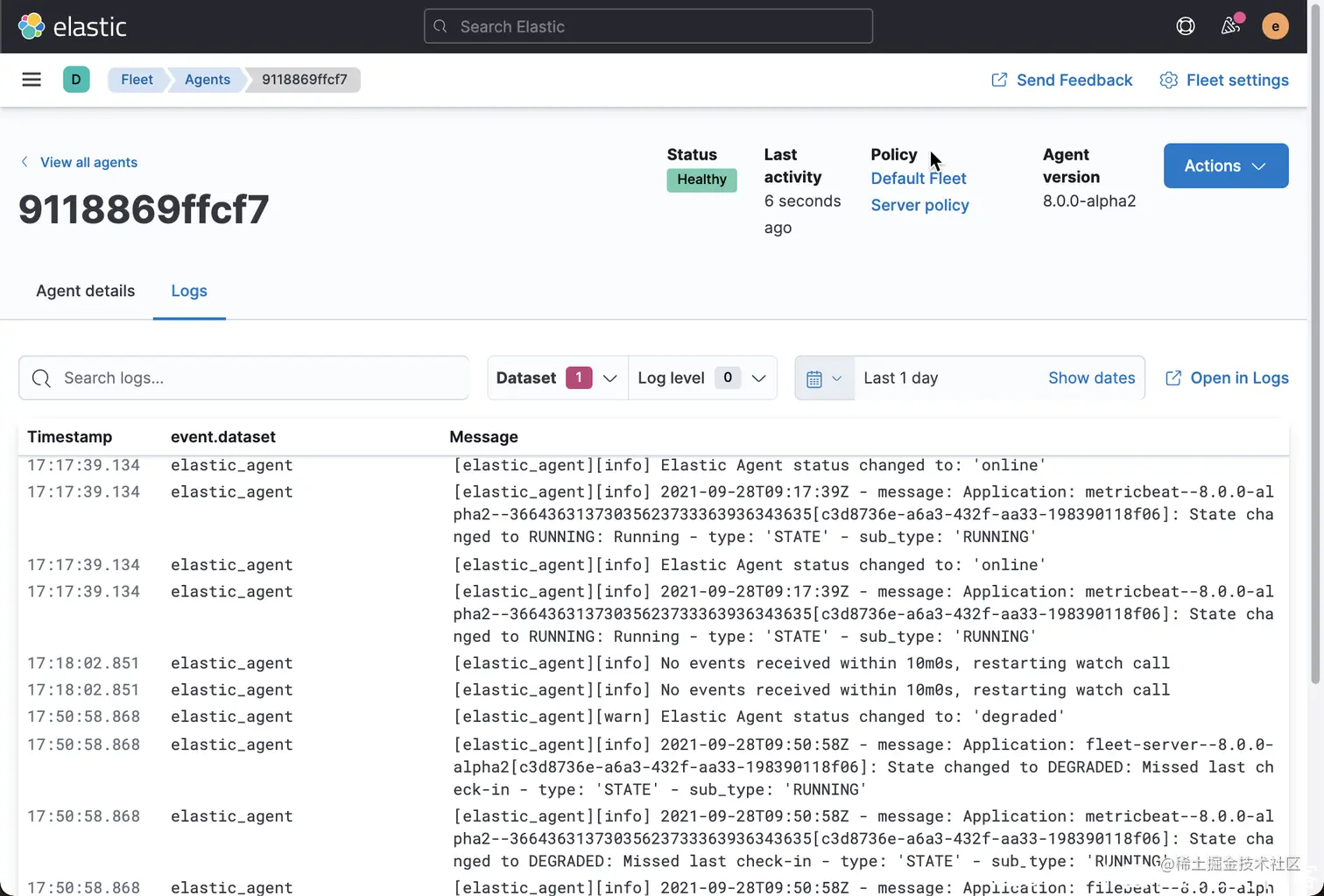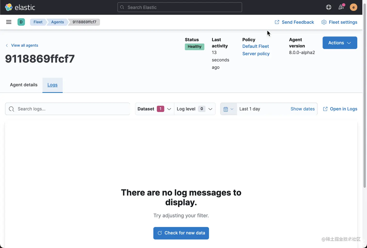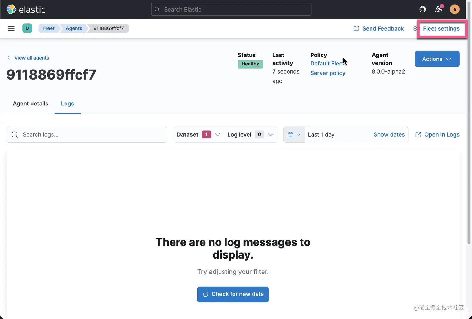我们可以看到在 Fleet 页面看到一个状态为 Healthy 的 agent。它目前使用的是 Default Fleet Server Policy。