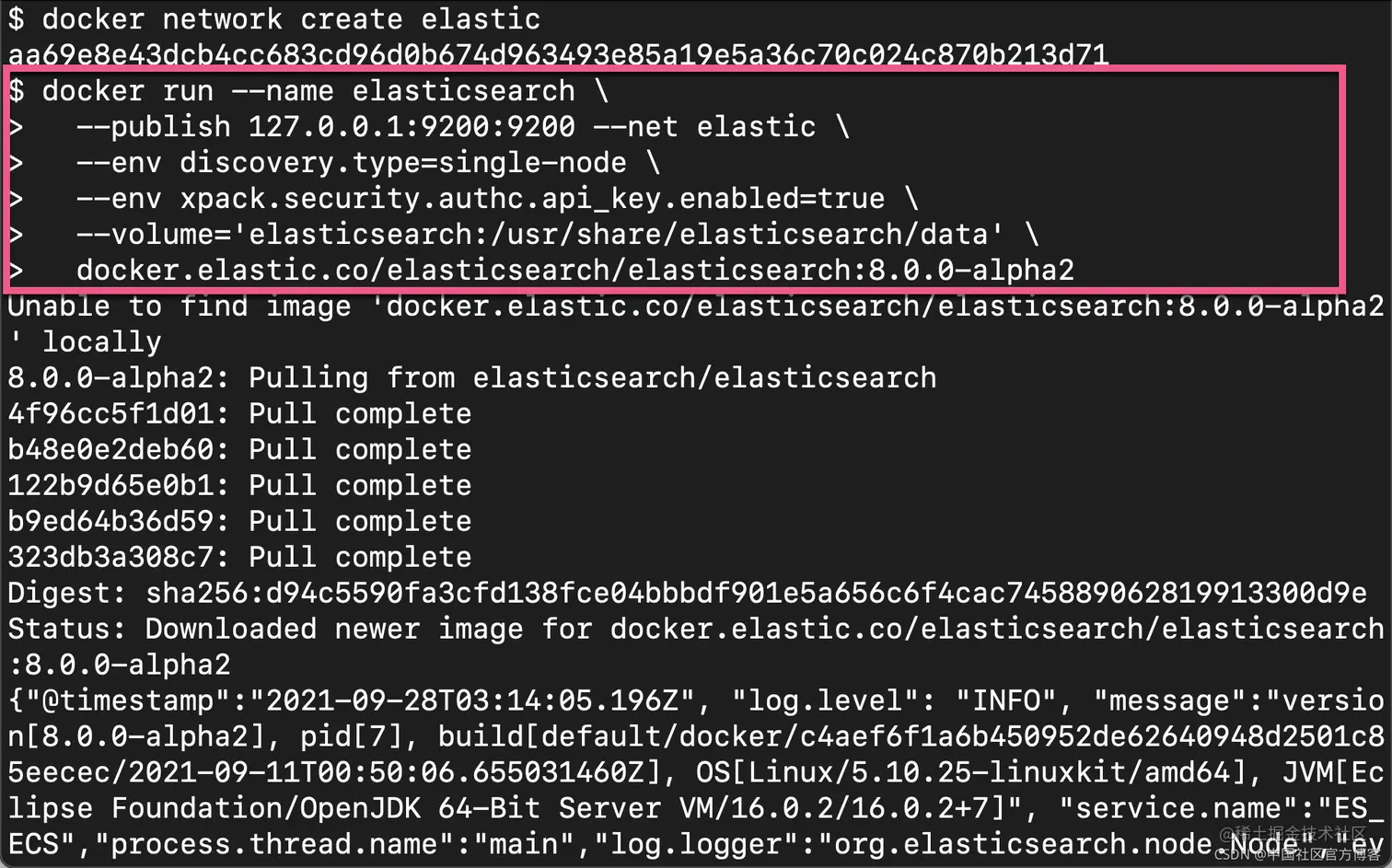 现在是时候使用 elasticsearch volume 和 elastic 网络启动单个(discovery.type=single-node)Elasticsearch 节点,同时还将其暴露给(本地)主机的默认端口 9200。 --name 将派上用场,特别是当堆栈中的其他组件要引用它时。 当未设置 TLS 时,需要启用 xpack.security.authc.api_key.enabled — 用于创建下面的 agent 的 API 密钥: