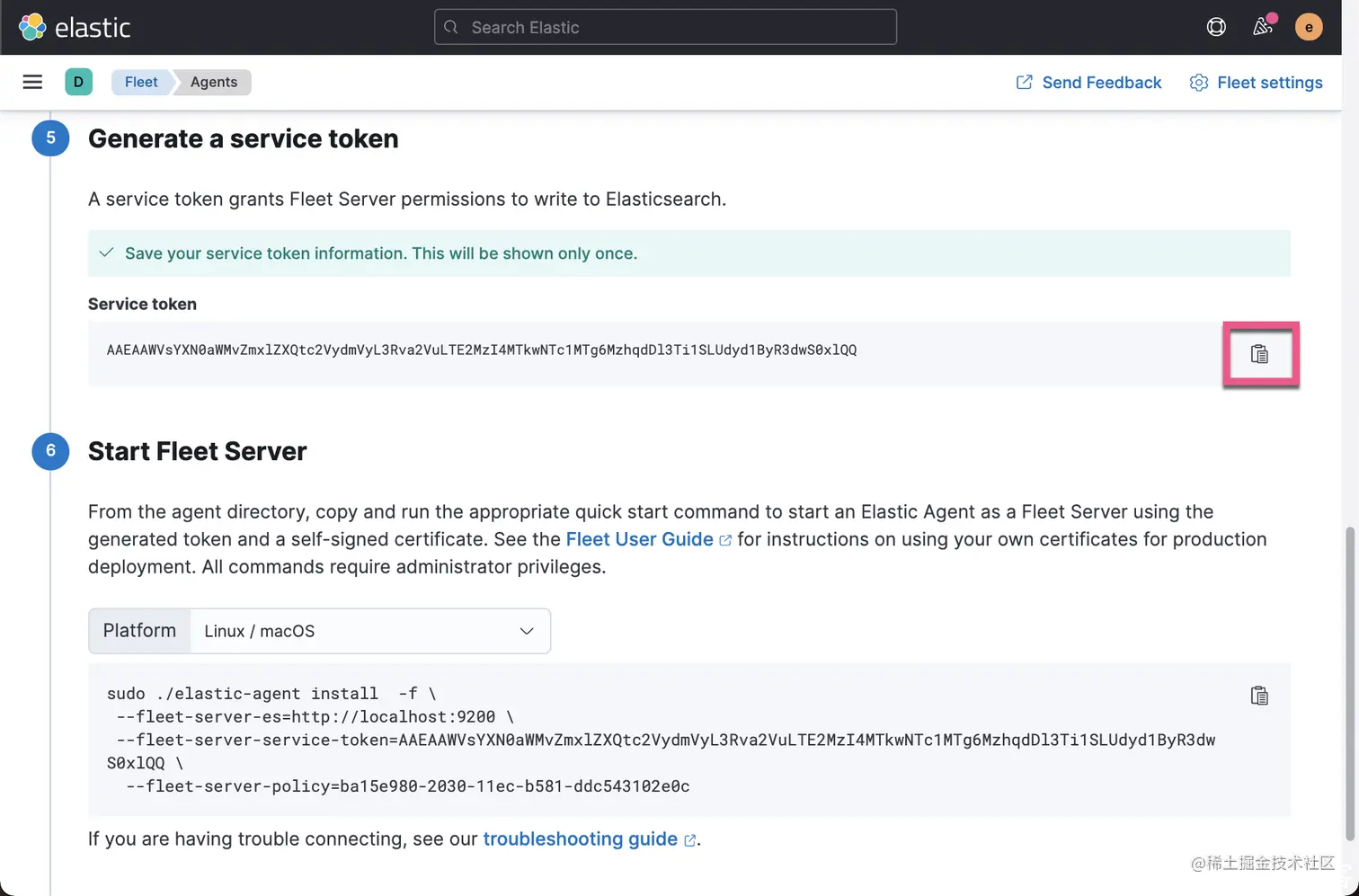 我们在一下的步骤中将会通过 docker 来安装 agent 服务器。它也同时将安装 fleet server。我们按照上面的步骤生产相应的 token: