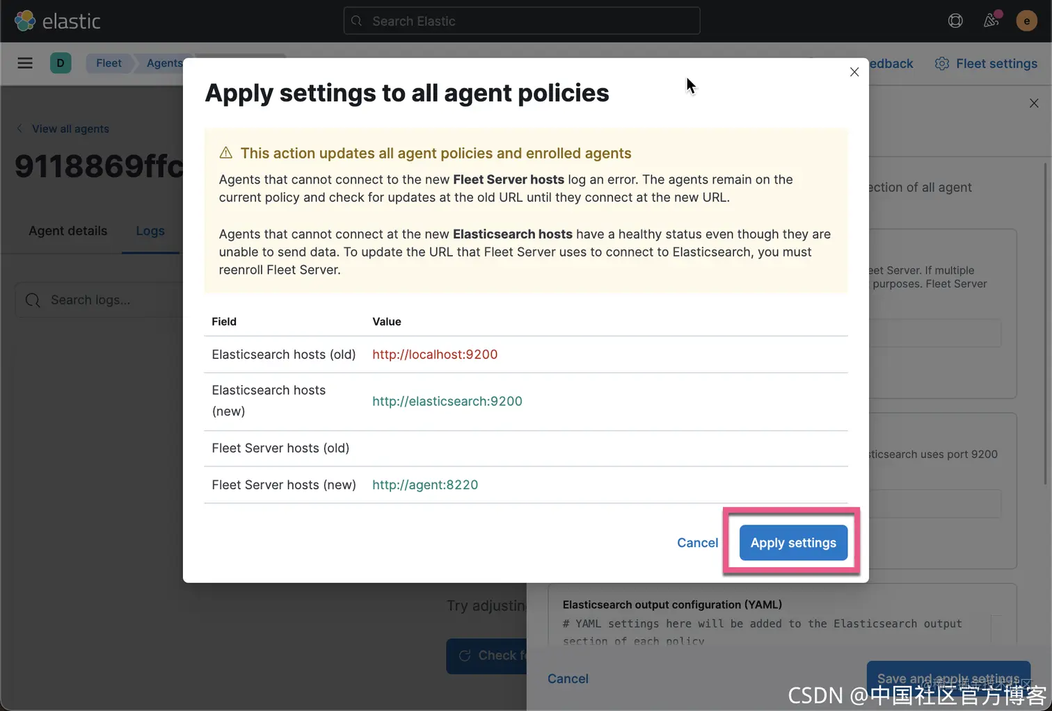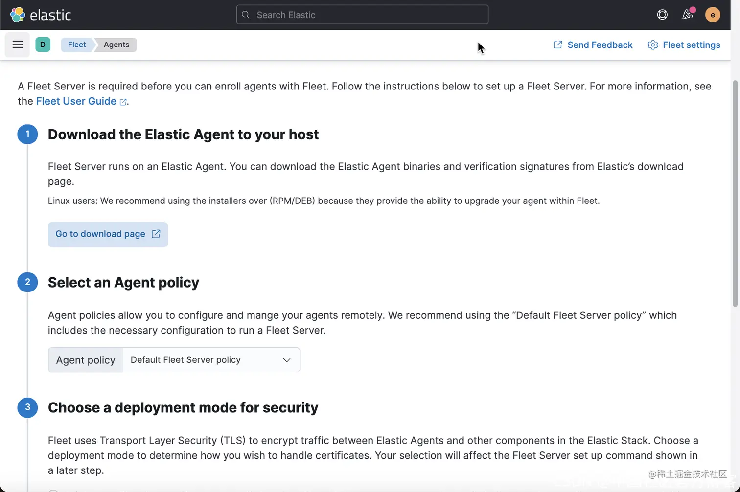 我们首先配置 Kibana 中的 fleet。前往 Kibana 中的 fleet 页面: