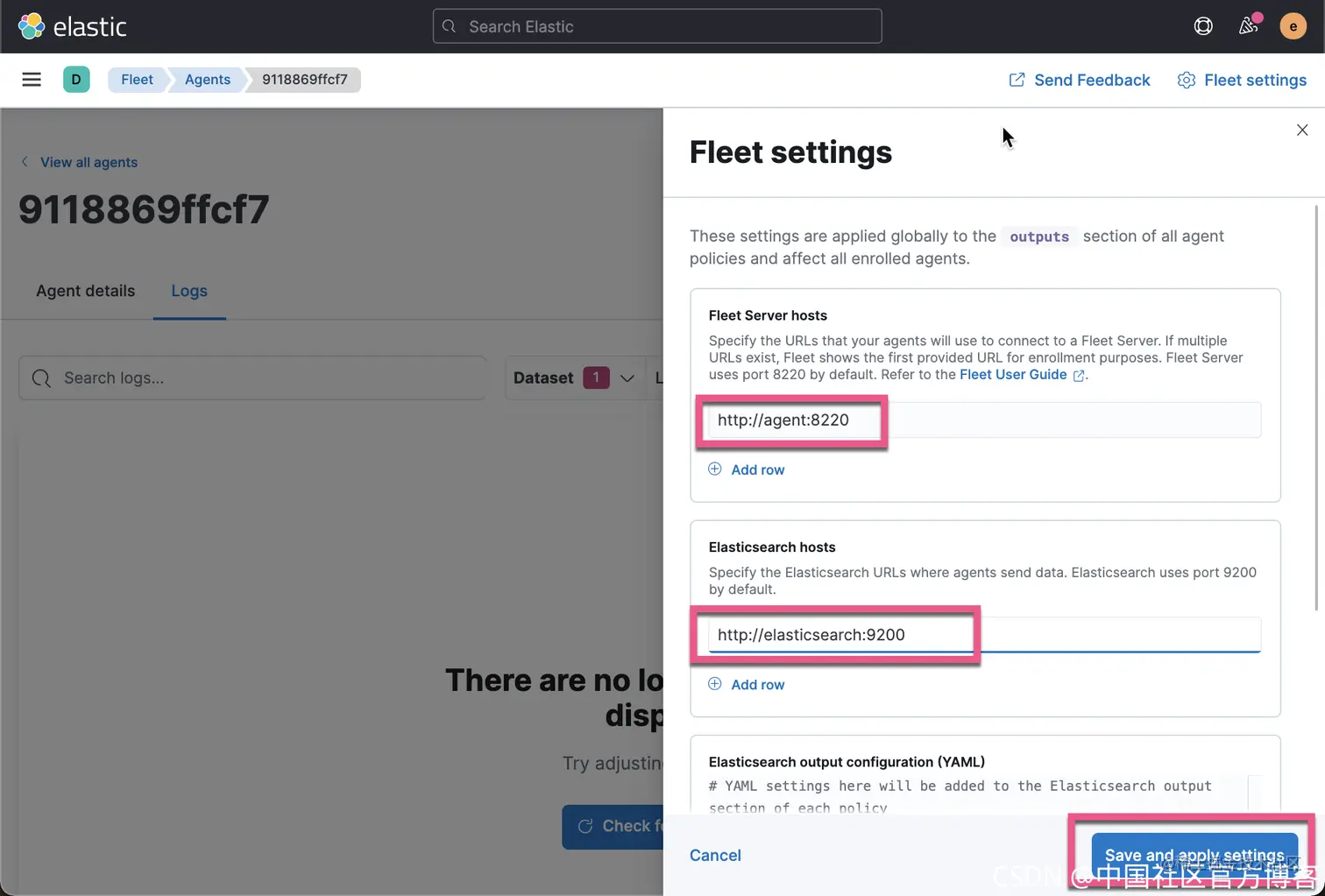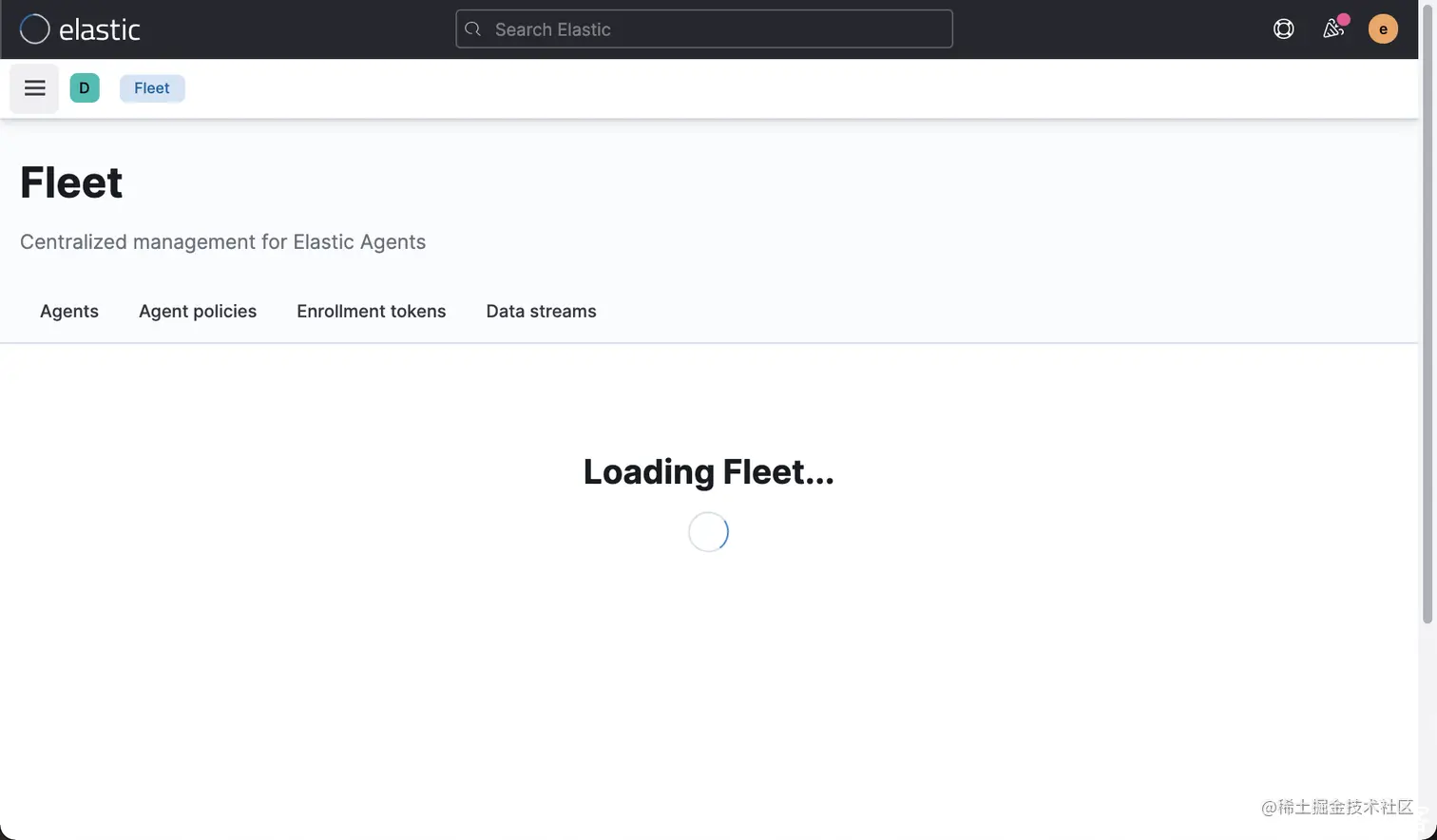 我们看不到任何的日志。这是为什么呢? 这说明我们的配置还是有些地方是不对的。原来我们还需要去设置一下 fleet server: