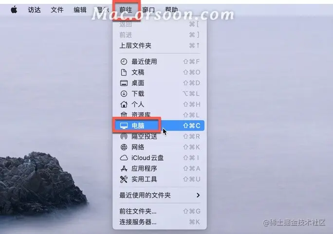 在访达的前往中选择电脑,如下图: