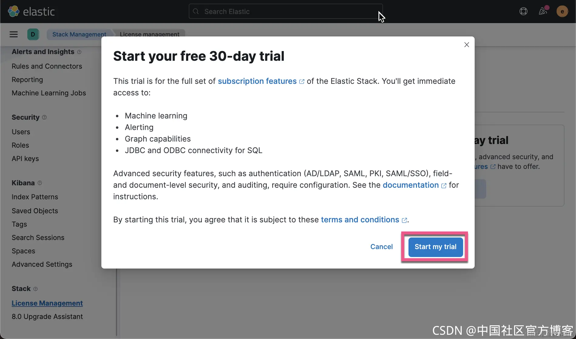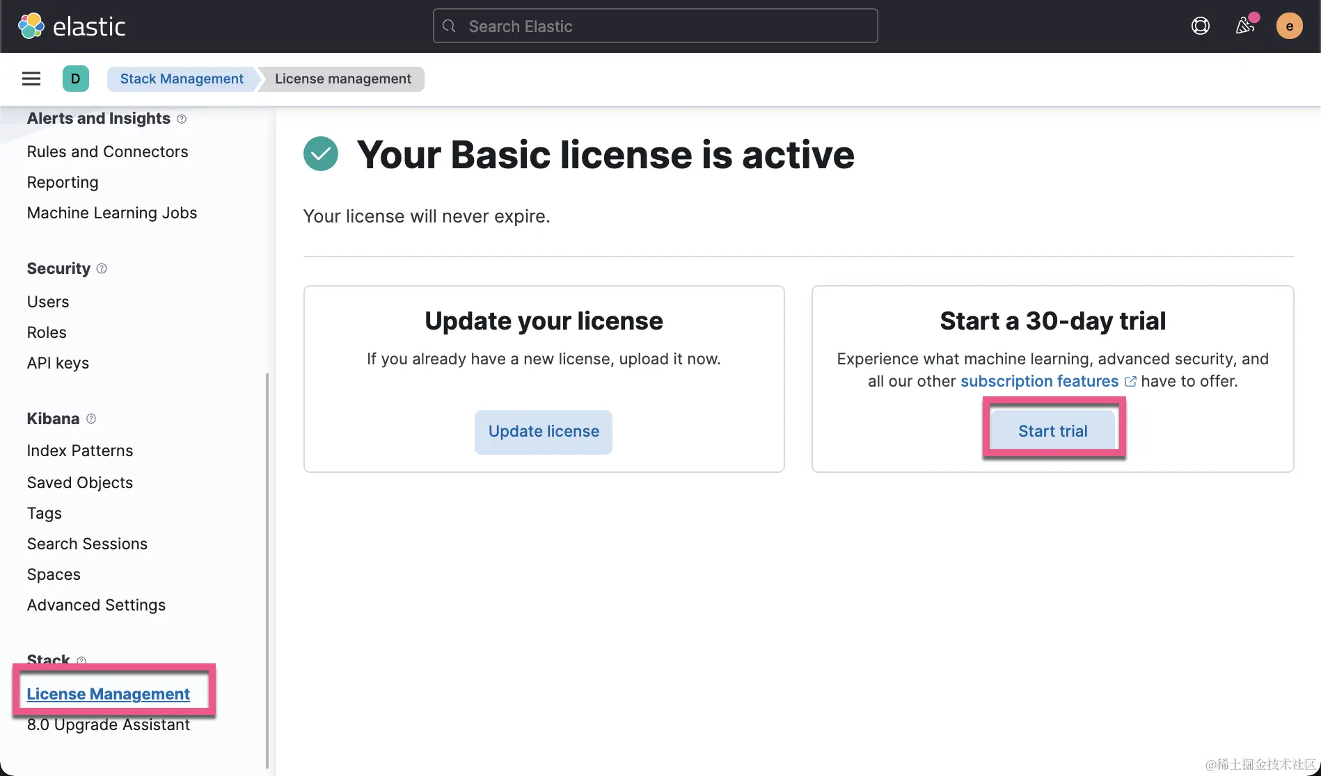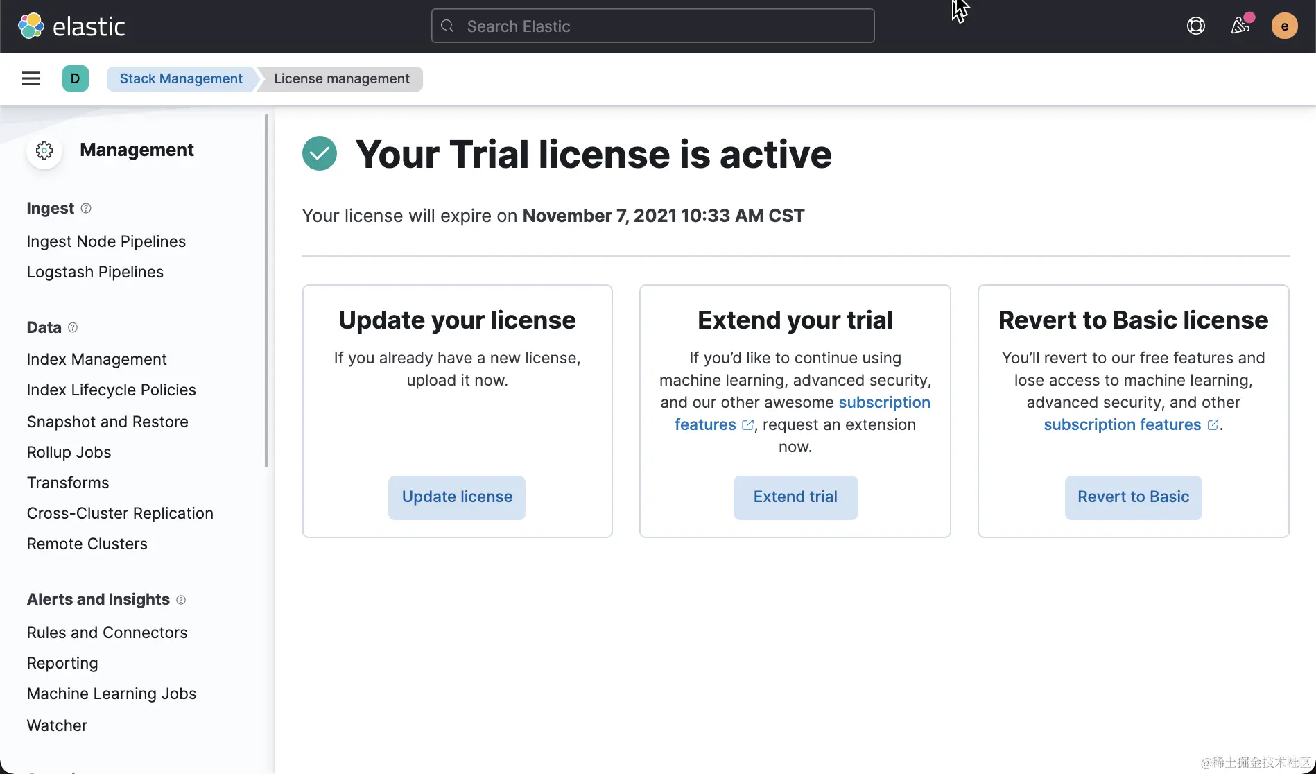 这样就启动了试用许可的功能。更多关于白金版及黄金版的信息可以在 Elastic 的官方网站 Elasticsearch 官方定价信息:Elastic Cloud、托管型 Elasticsearch | Elastic 找到更多的信息。
