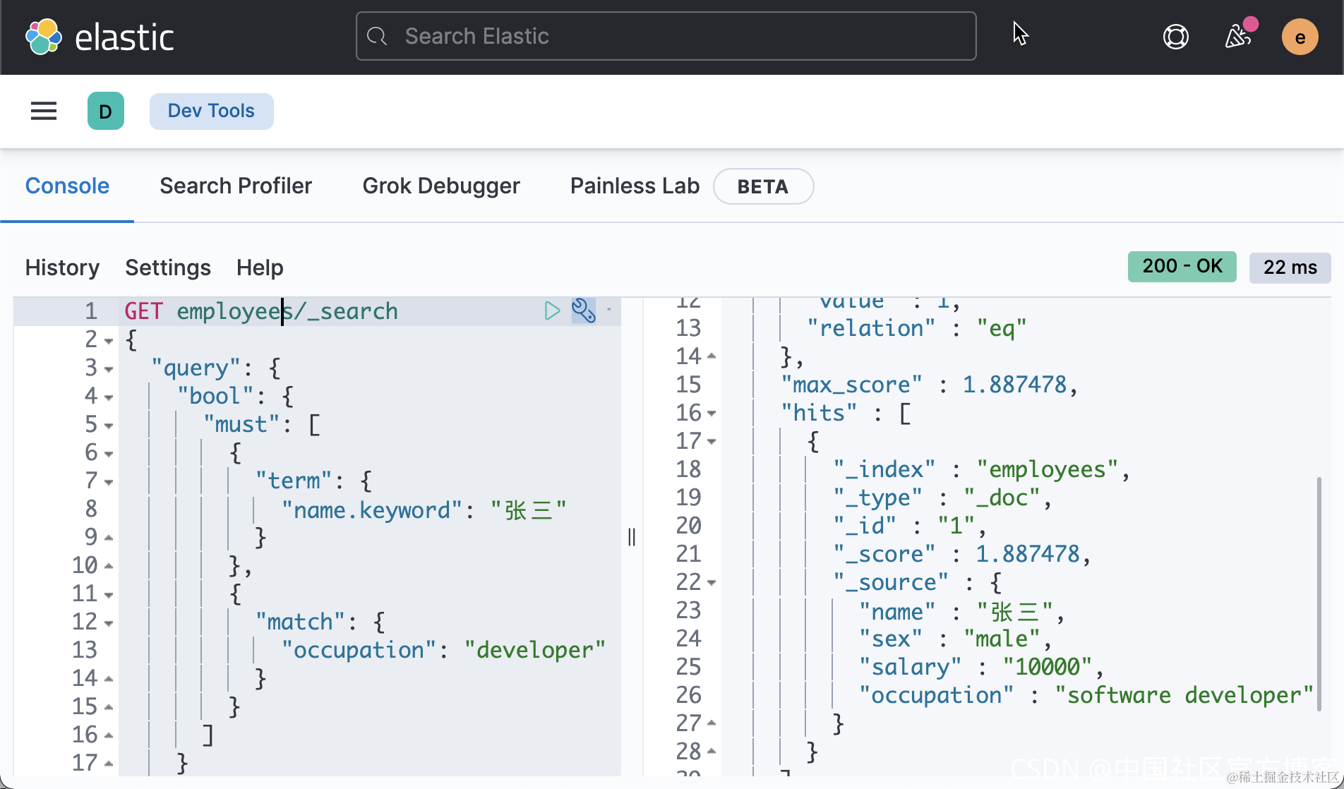 再接下来,我们来搜索 name 为 “张三” 并且 occupation 为 developer 的文档。我们来完成