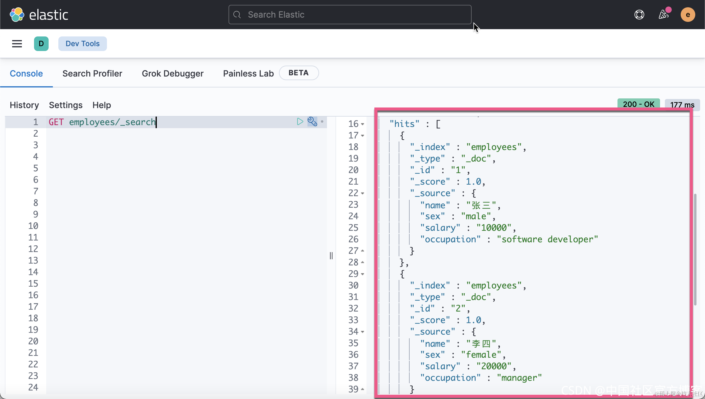我们首先在 Kibana 中针对 employees 来做一个如下的查询。我们查询所有的 employee: