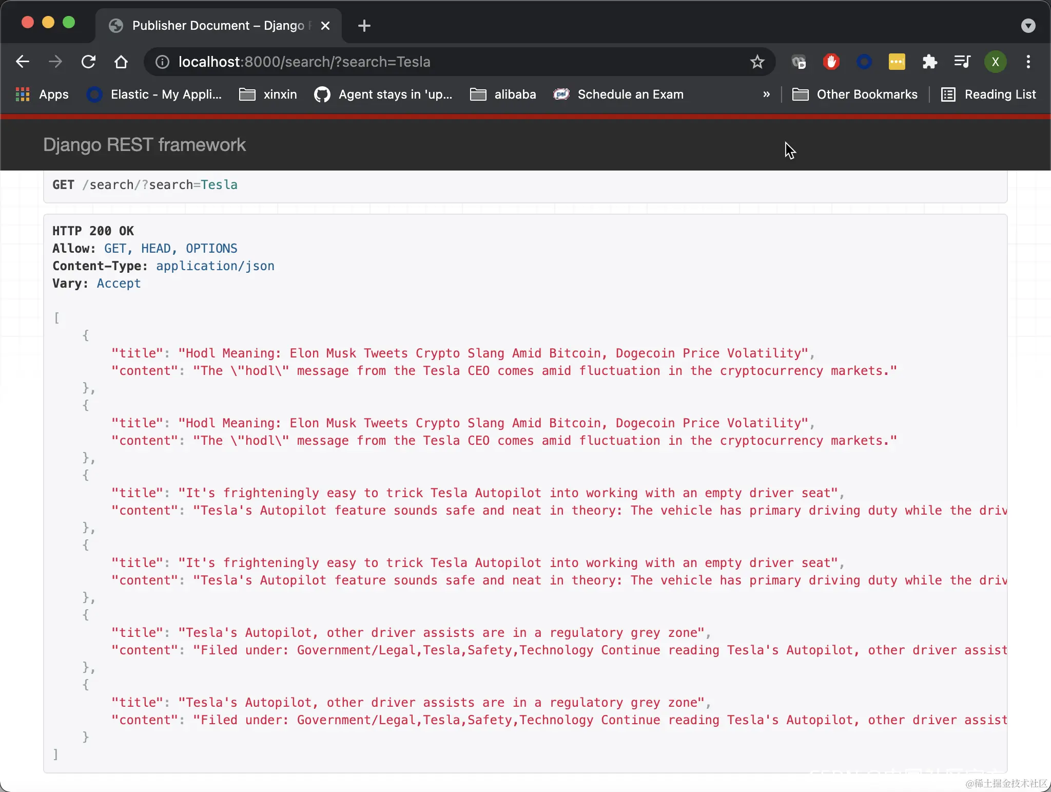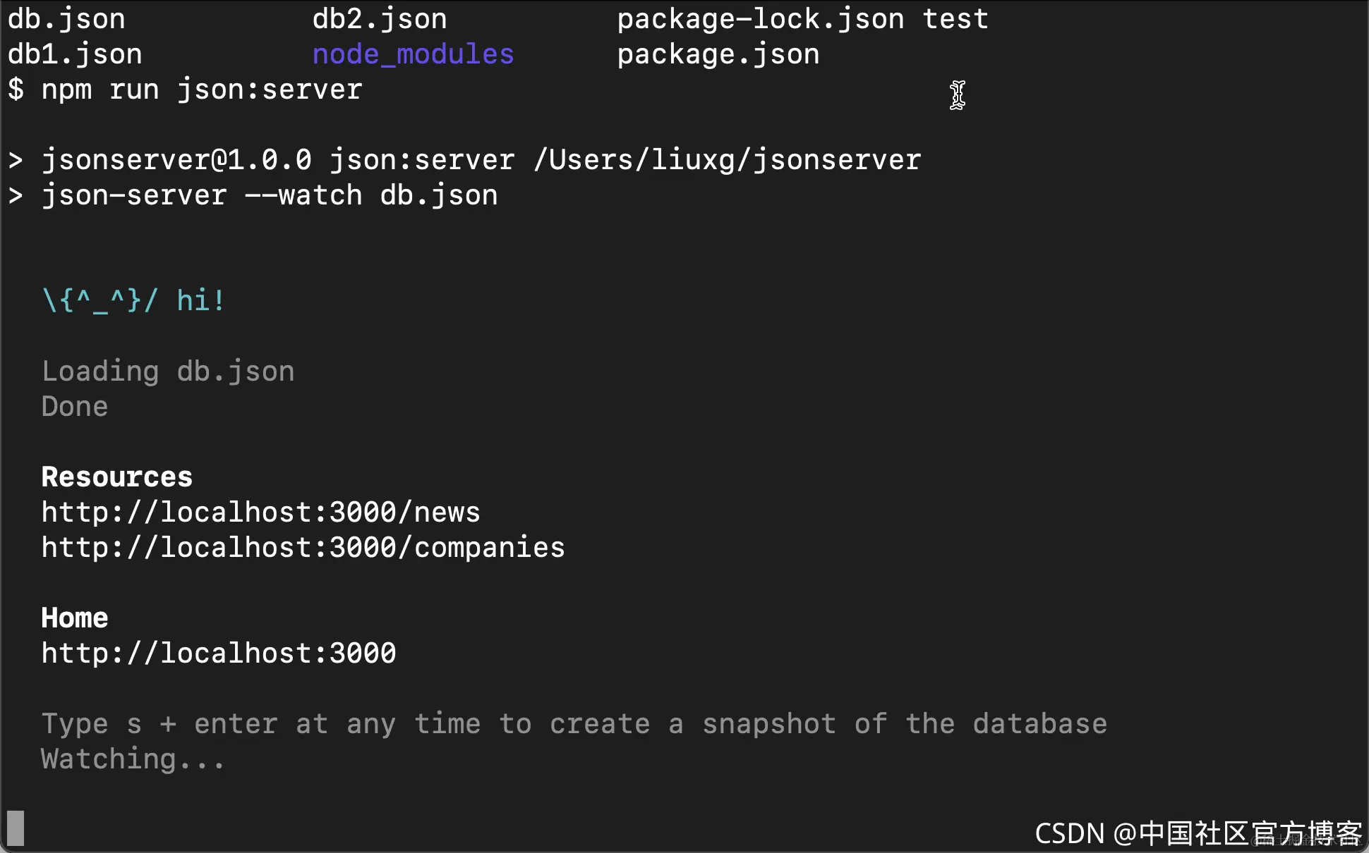 为了能够在 django 中写入一些文档到 Elasticsearch 中,我仿照文章 “json-server模拟后端接口” 来创建一个本地的 JSON 色server。它的目的是为了让 django 的代码读取这个接口并写入到 Elasticsearch 中。我们可以仿照文章中的步骤,并编辑相应的 db.json 文件如下: