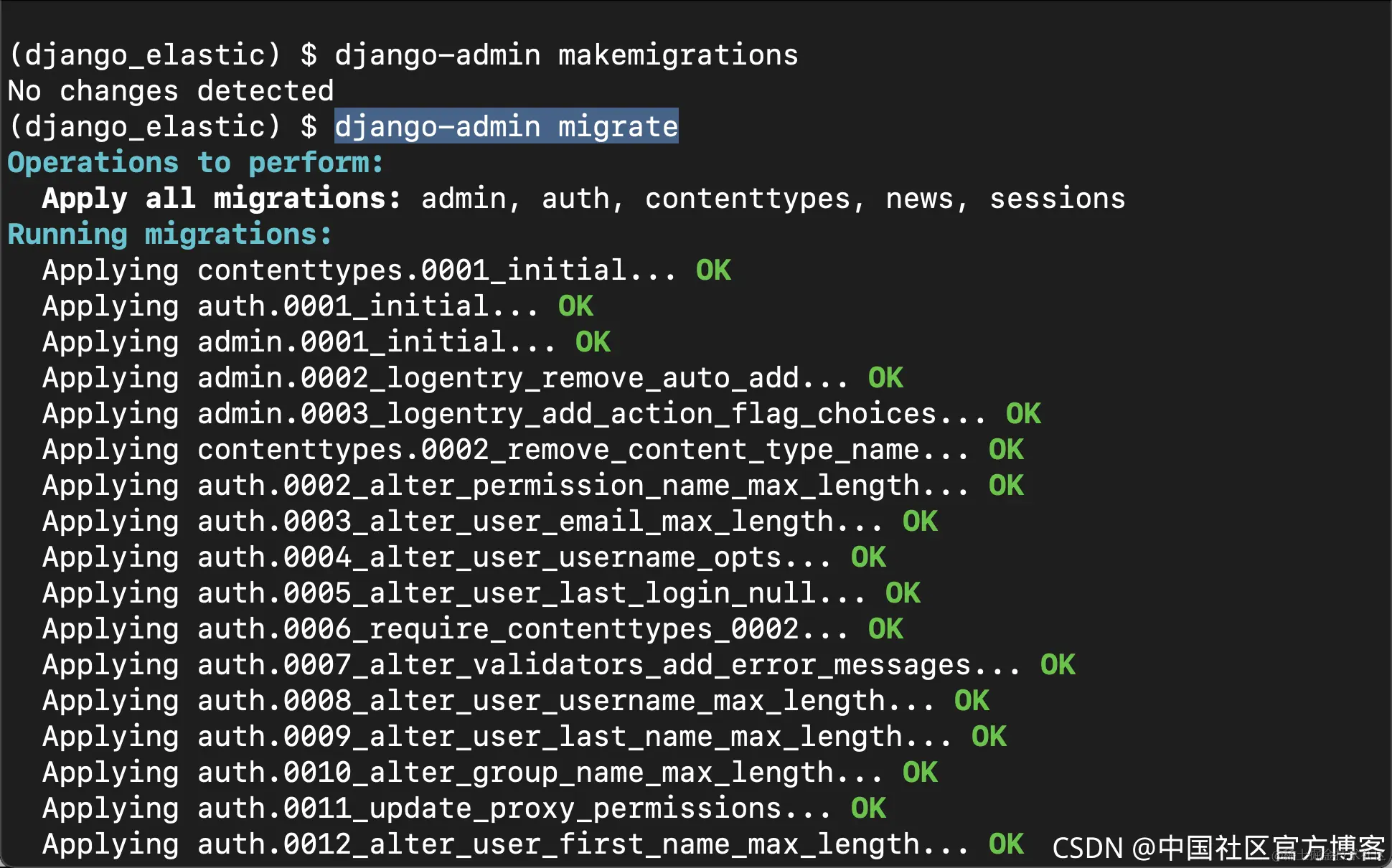 请注意上面的 elastic.settings 中的 "elastic" 是项目的名称。我们可以在 manage.py 中找到相应的字符串。经过上面的修改后,我们可以使得如下的命令能够顺利地执行: