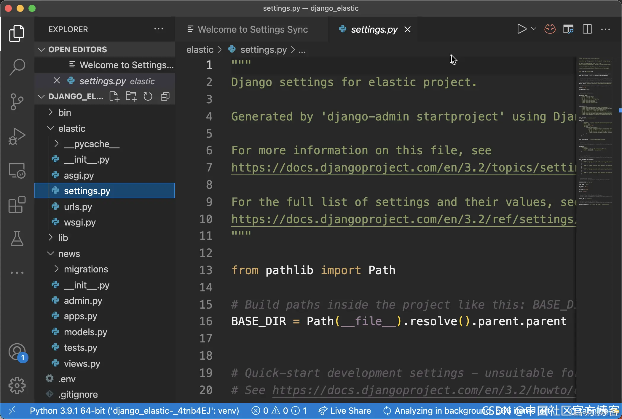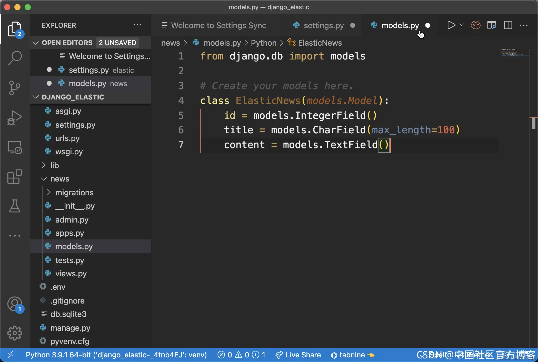 在这节中,我将展示如何在 Django 中使用 Elasticsearch。我们接着上面已经创建的 django 项目继续修改。