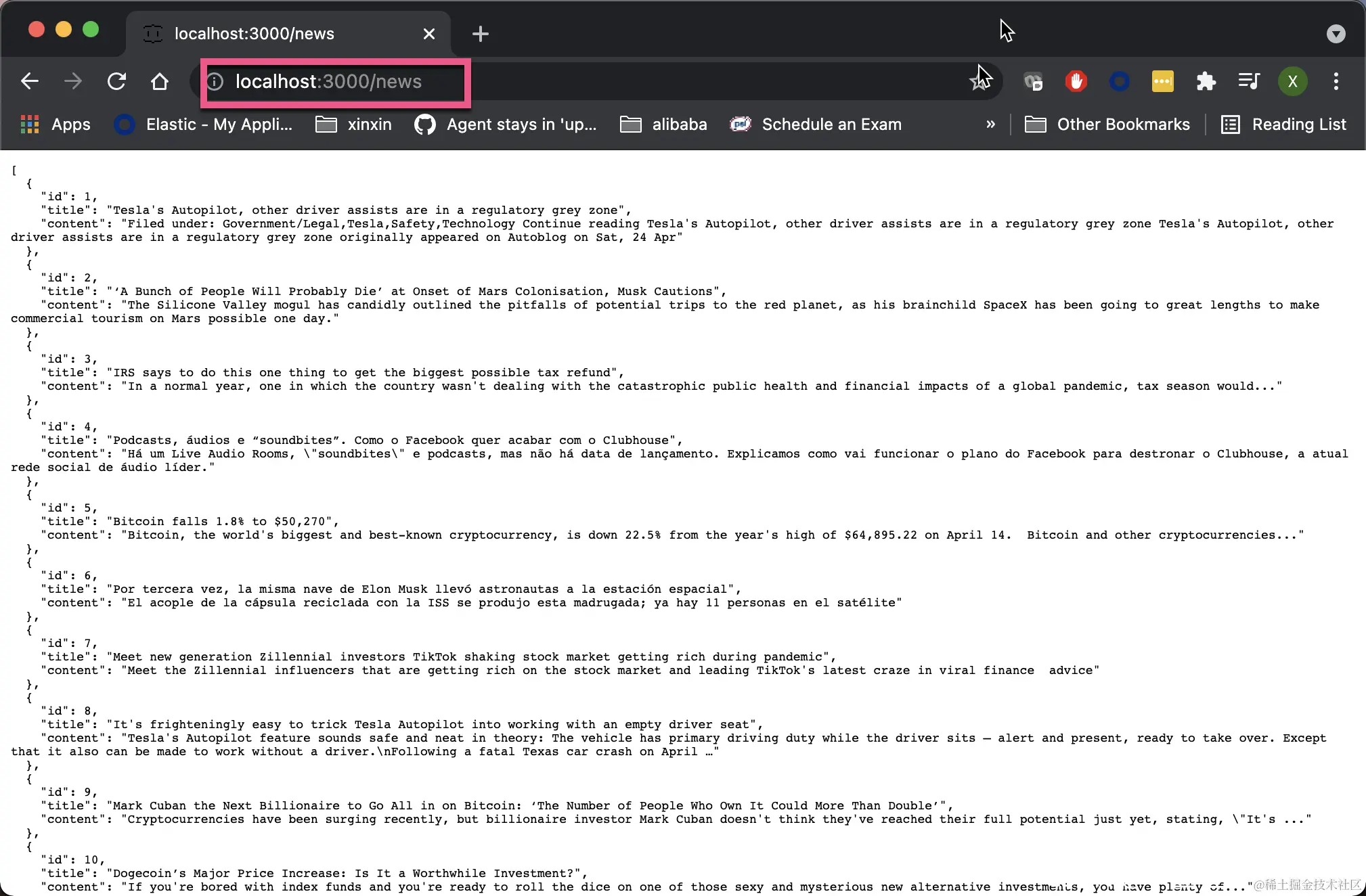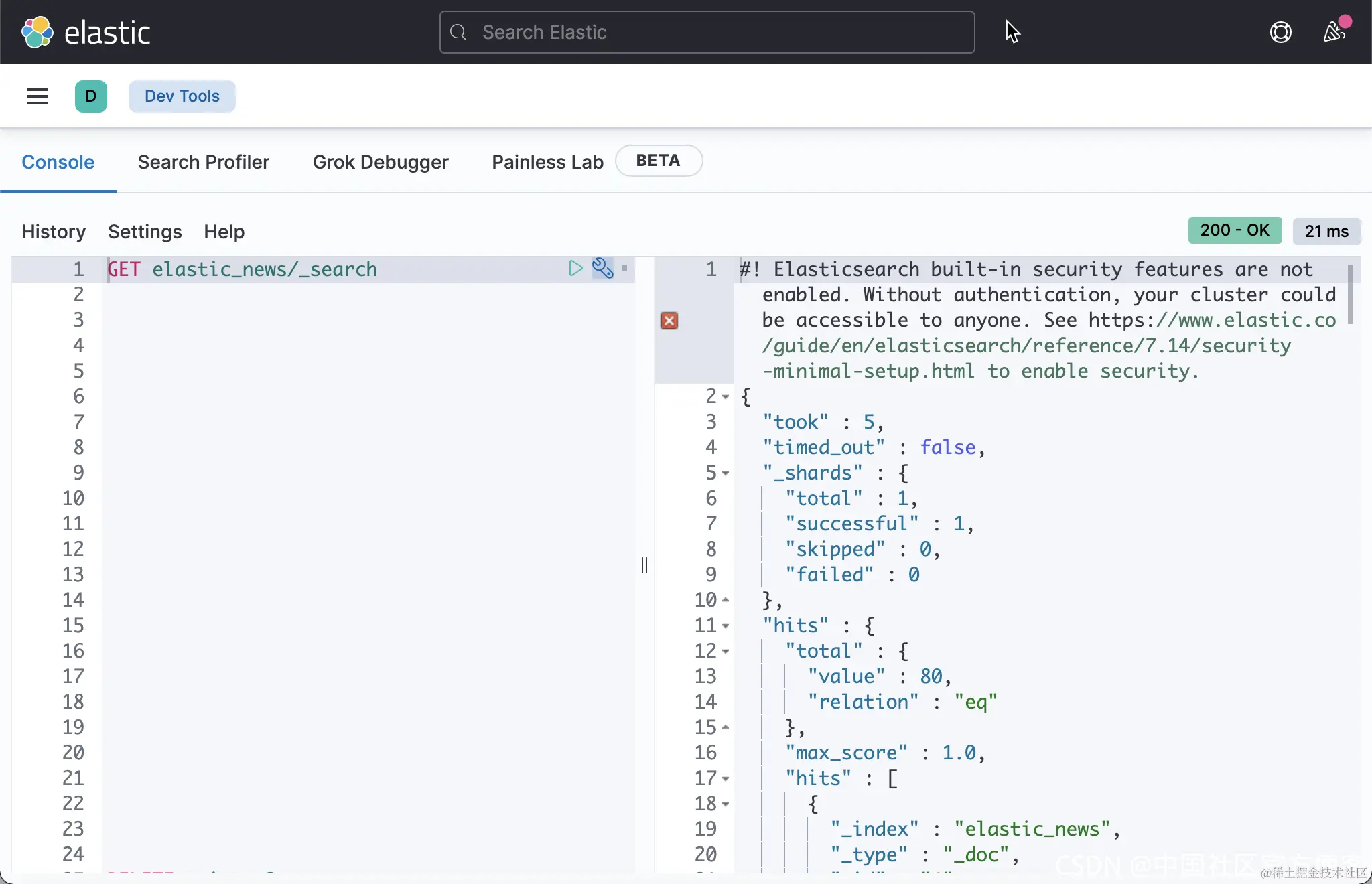 按照我们的设计,它将为 elastic_news 索引创建一些文档。我们可以在 Kibana 中进行查看: