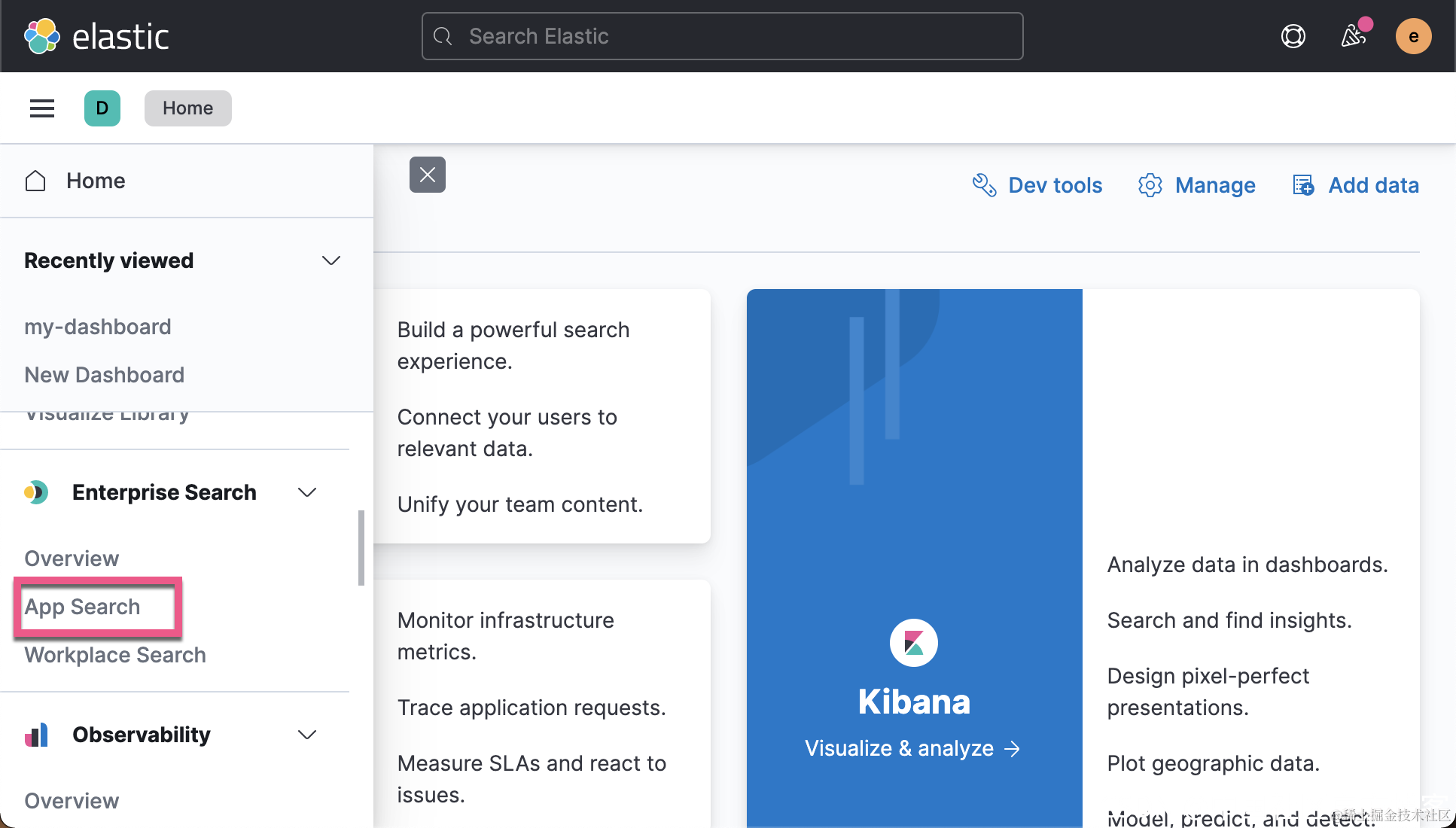 你需要根据自己的 enterprise search 的 IP 地址来进行设置。修改完这个配置后,我们需要重新启动 Kibana。这样我们就可以在 Kibana 中查看到 App Search: