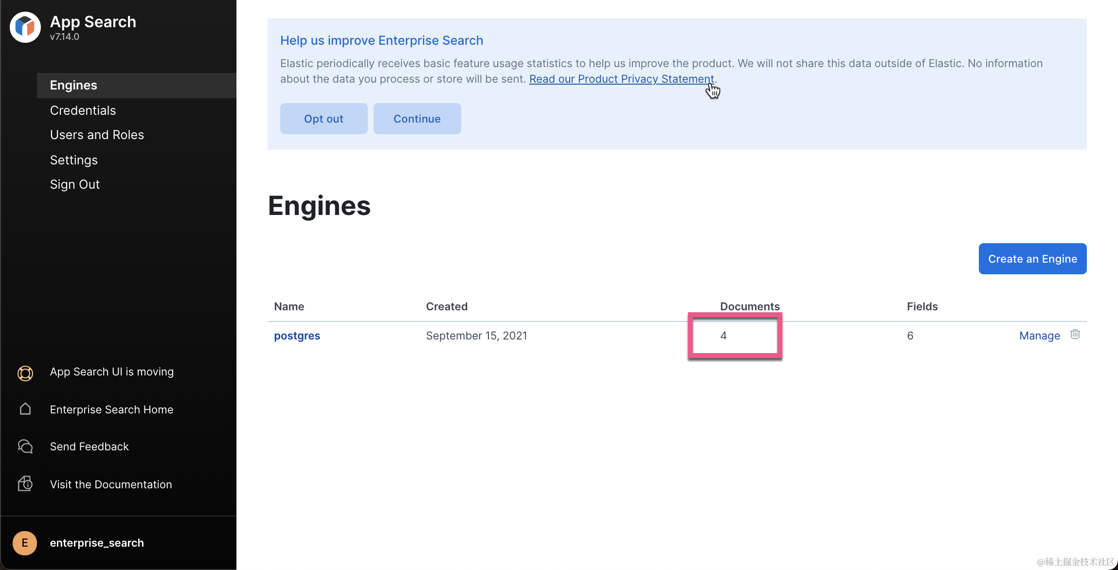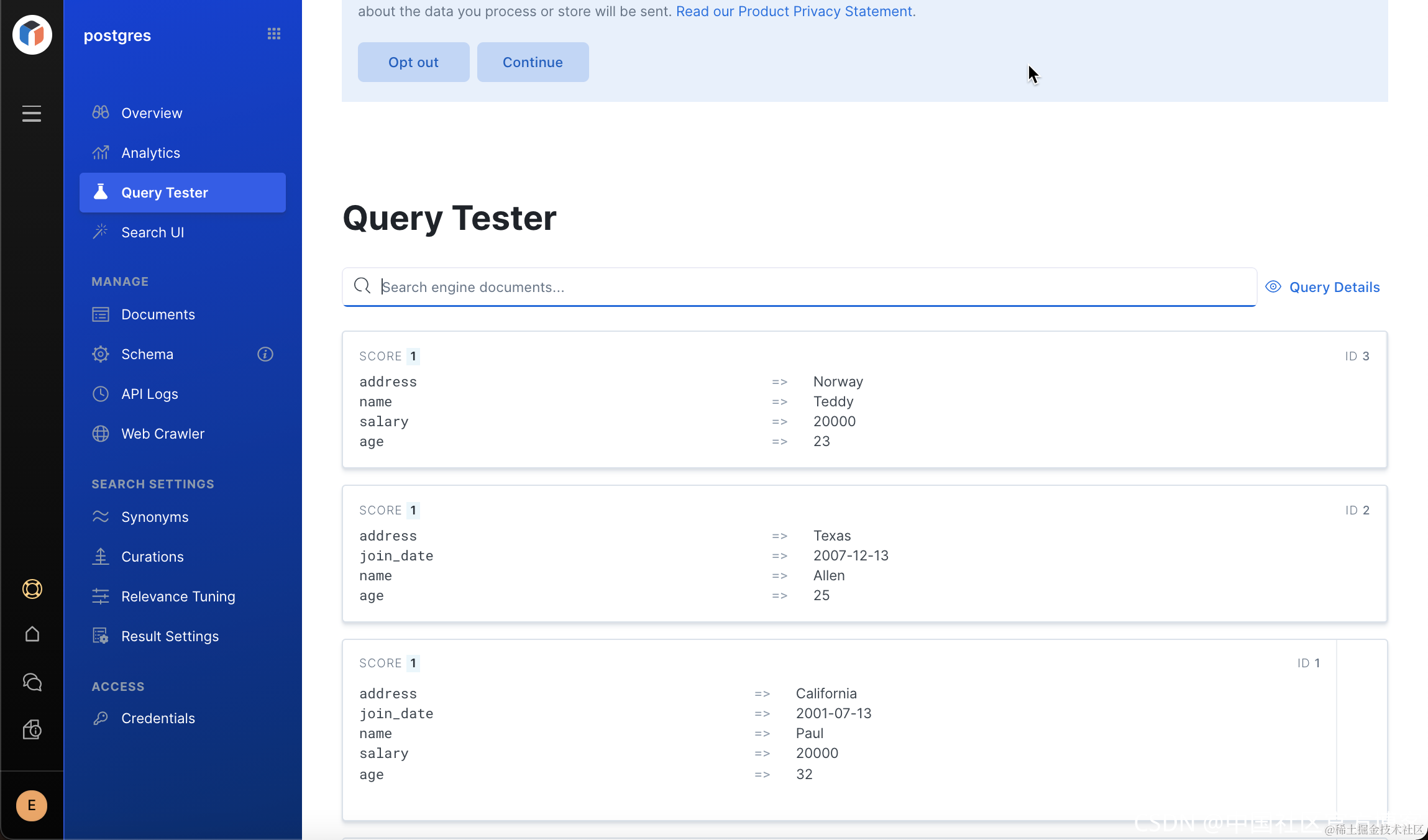 这样我们在 Postgres 数据库中的文档就被成功地导入到 App Search 的引擎中了。我们可以通过如下的方式来进行查看: