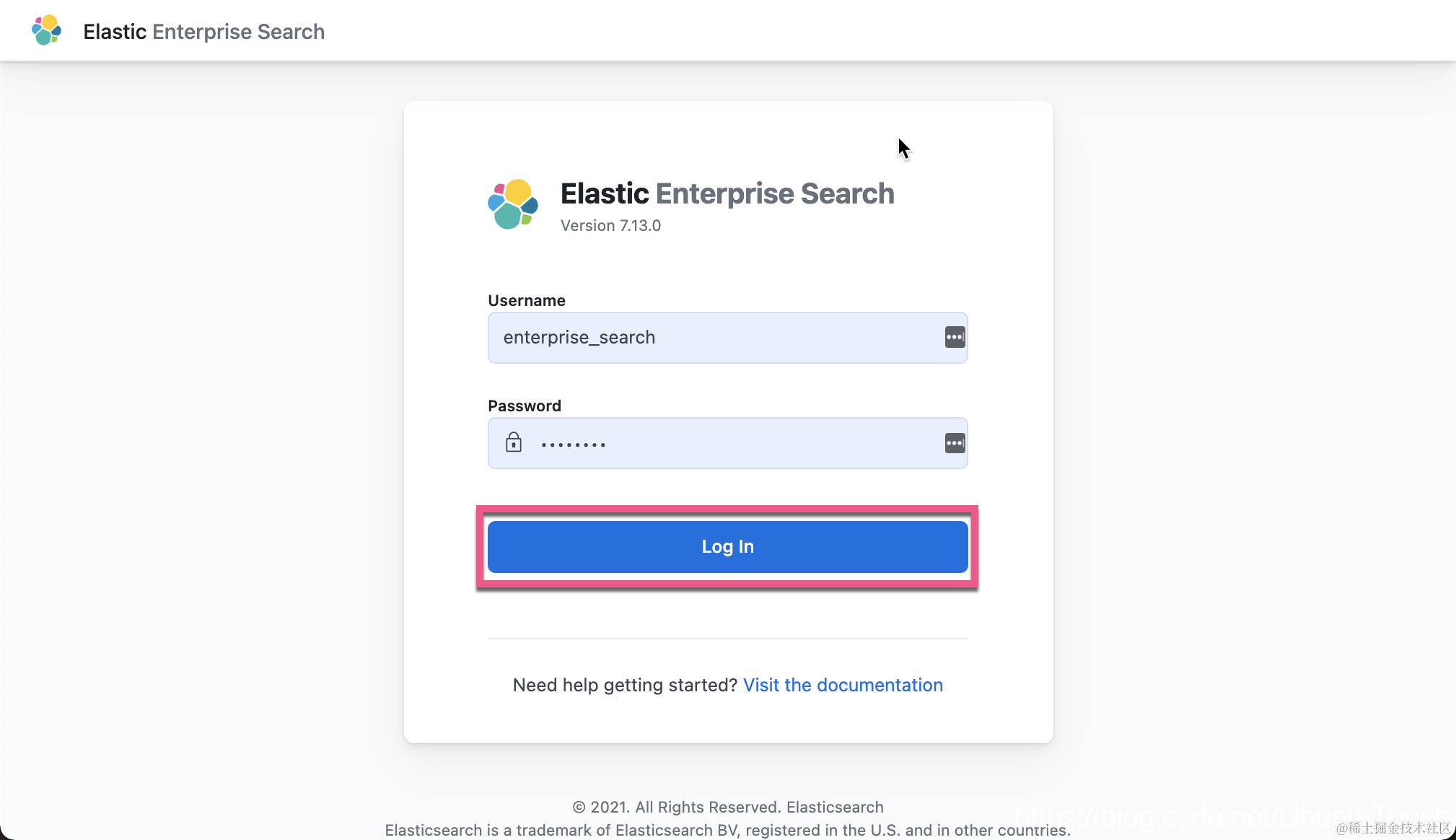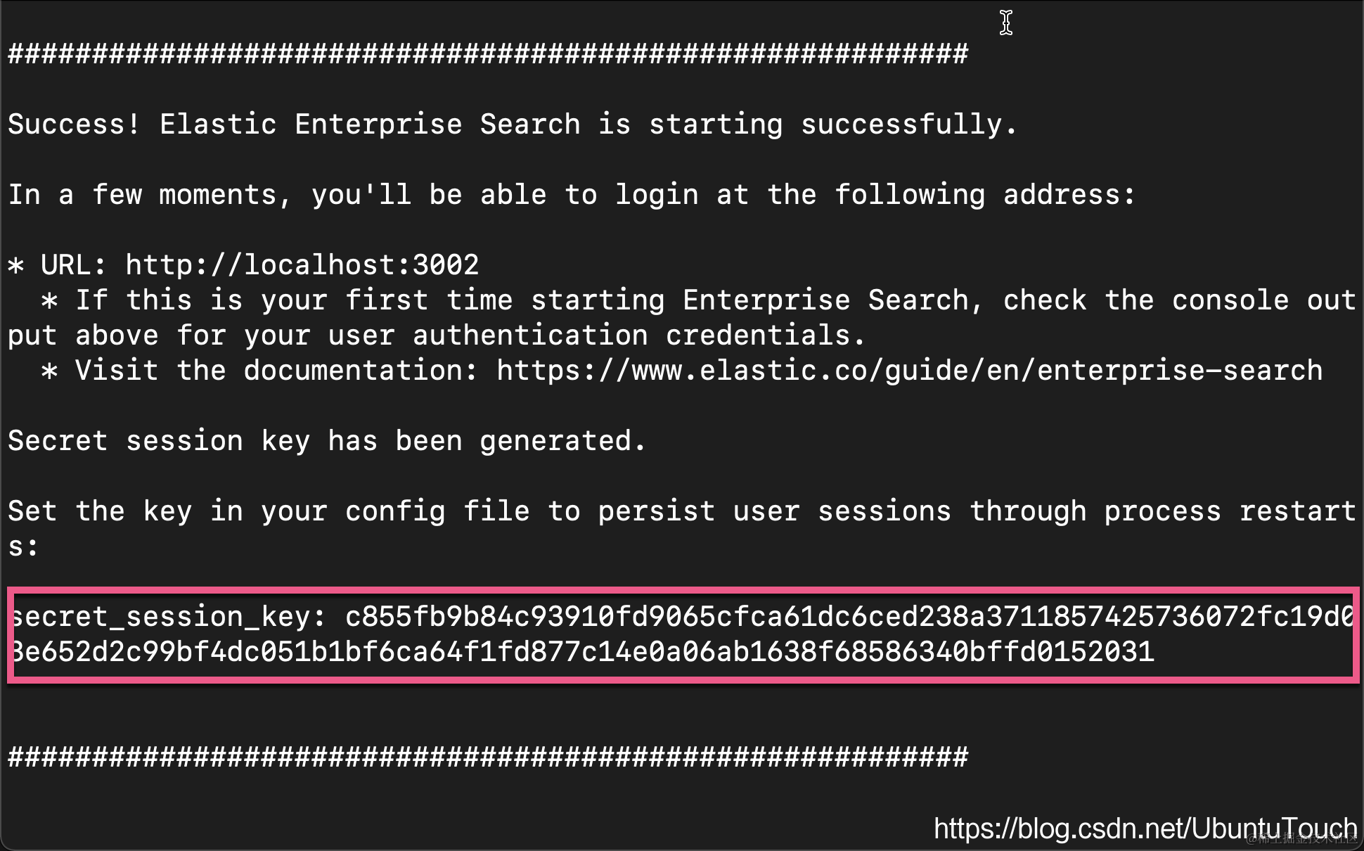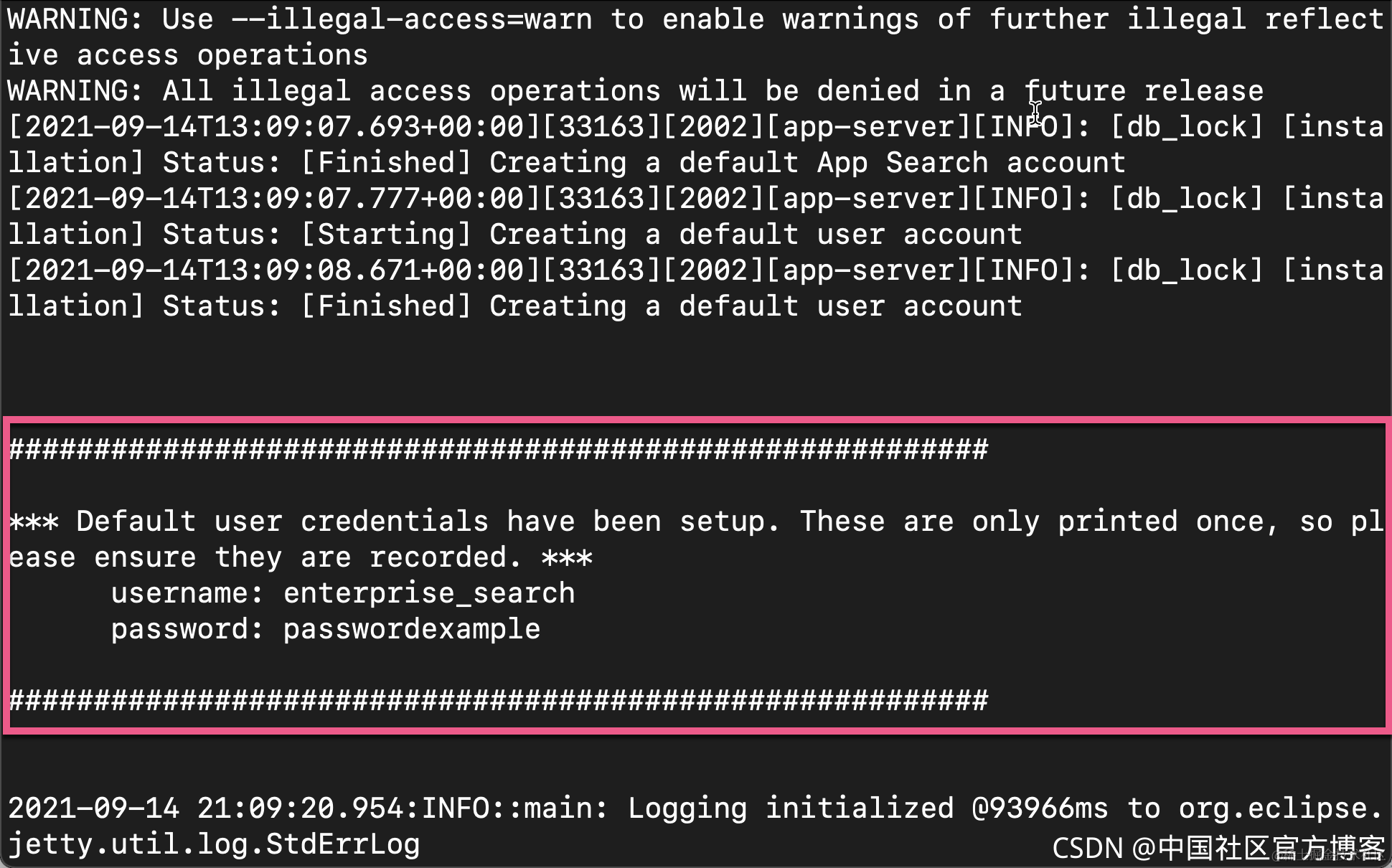 在启动的过程中,我们可以看到 enterprise_search 的用户名及密码: