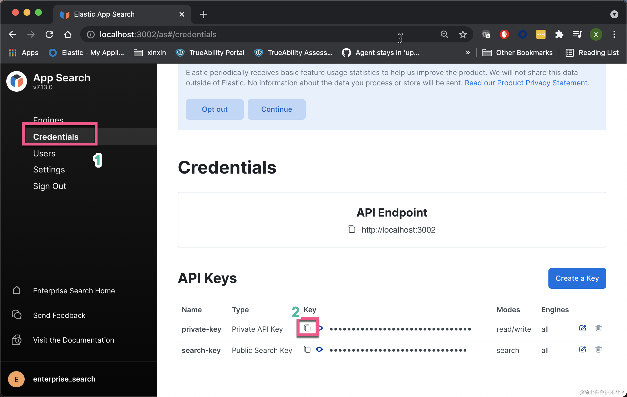 为了能够保存 session,我们可以把上面的 secret_session_key 添加到 config/enterprise-search.yml 中去。