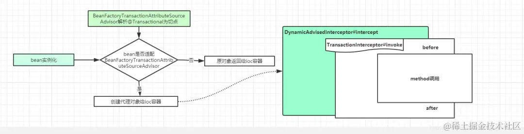 首先是@Transactional,作用是定义代理植入点。我们知道代理对象创建的通过BeanPostProcessor的实现类AnnotationAwareAspectJAutoProxyCreator的postProcessAfterInstantiation方法来实现个,如果需要进行代理,那么在这个方法就会返回一个代理对象给容器,同时判断植入点也是在这个方法中。