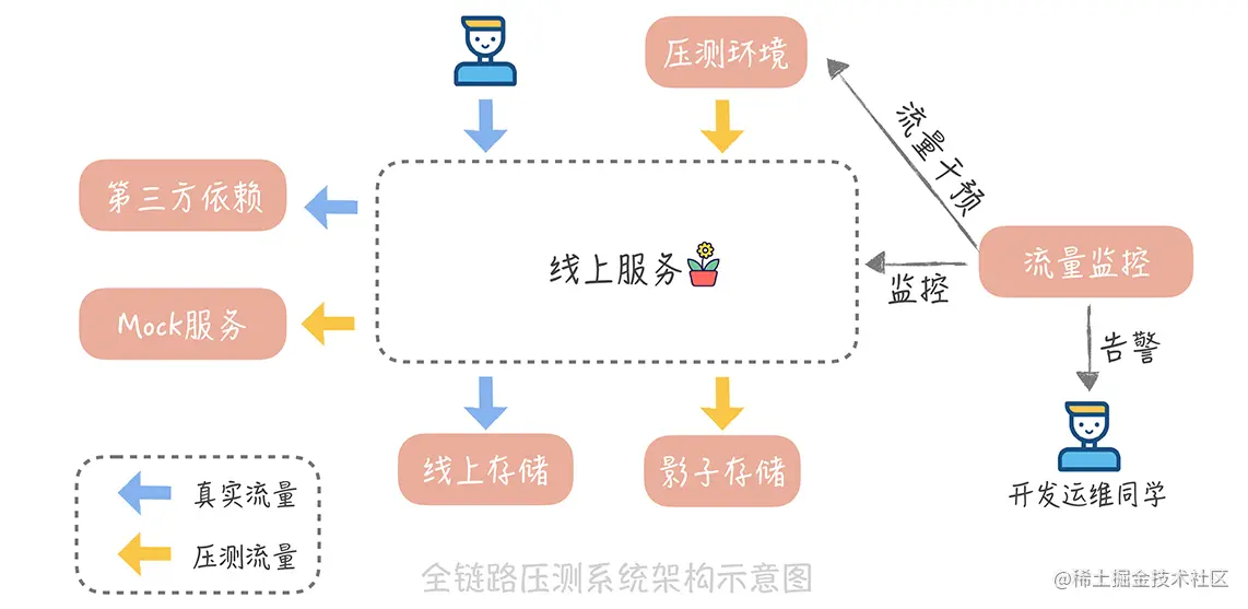 - 对压测的流量需要增加标记,这样就可以通过 Mock 第三方依赖服务和影子库的方式来实现压测数据和正式数据的隔离;
