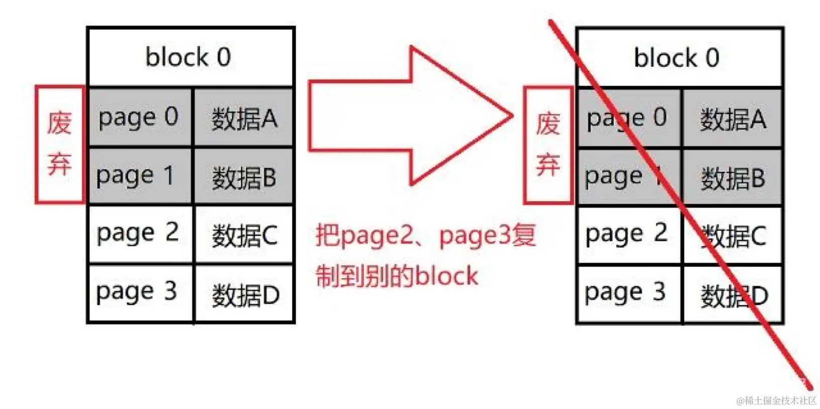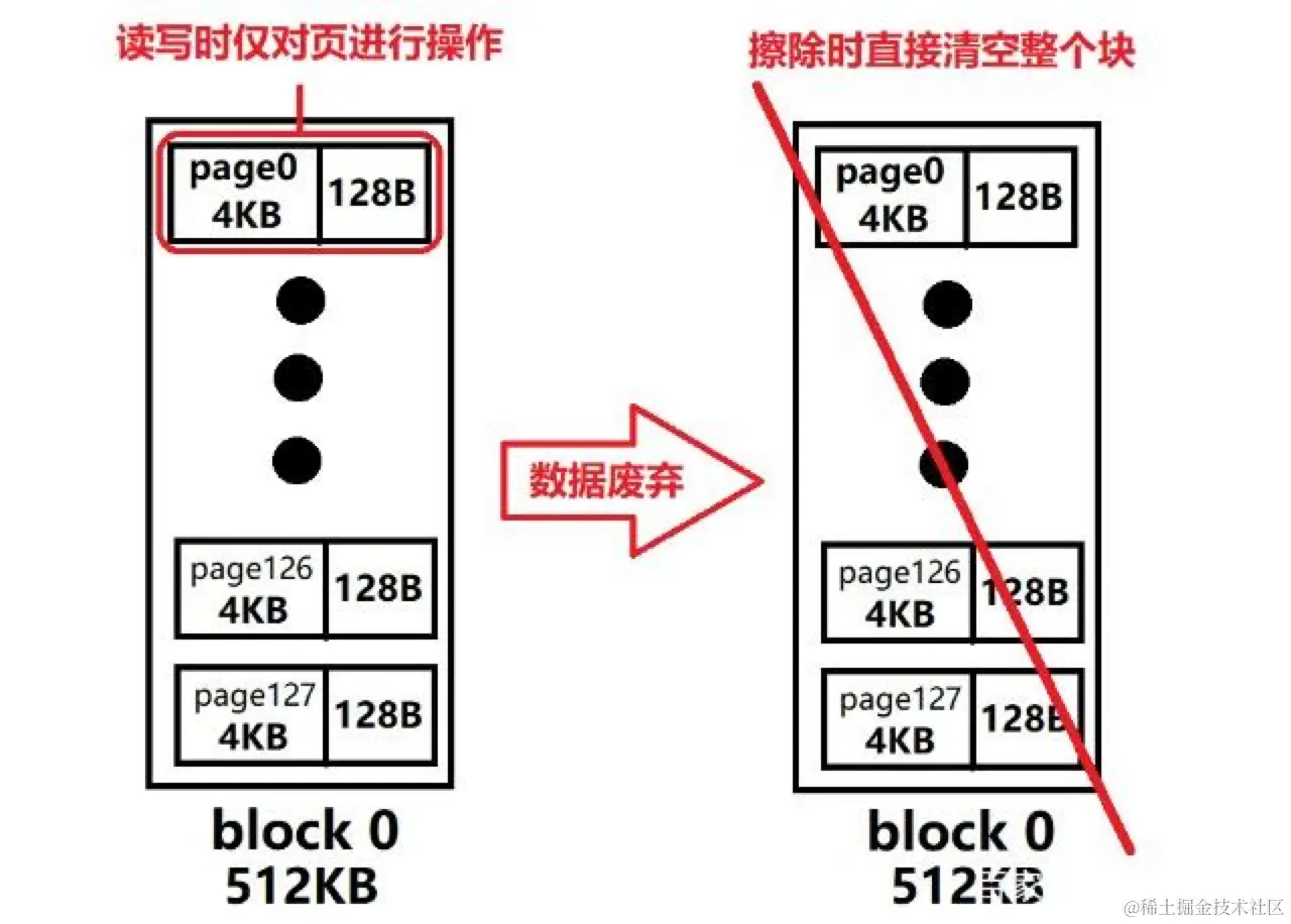 写入时,会以page为单位,我们可以看到图里是4kb。这意味着你哪怕写1b的数据,也要占据4kb。这还不是最致命的,最致命的是删除,删除是以整个block为单位发生的。图中是512kb,这意味着你哪怕删里面1kb的数据,都要导致写放大发生。