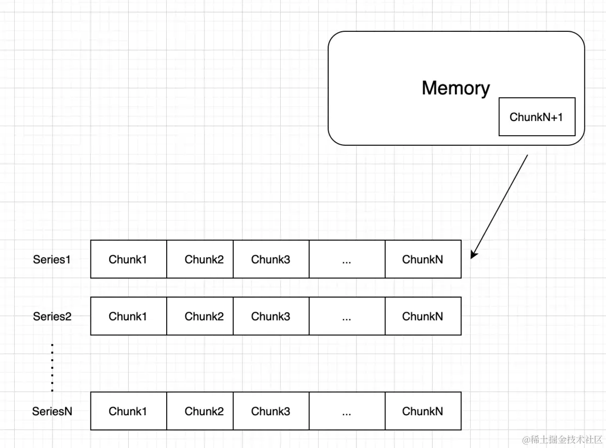 于是Prometheus又改进了一版存储。每一个Series一个文件,每个Series的数据在内存里存满1KB往下刷一次。