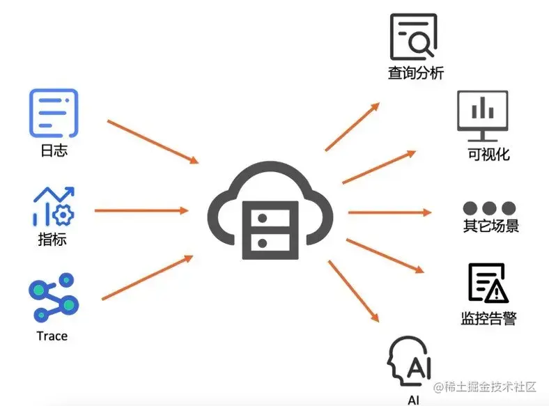 在这里,我们将日志、指标、Trace等数据全部接入到一个统一的可观测性存储中。然后基于这个统一的存储,进行后续的查询分析、可视化、监控告警、AI 等上层能力,甚至还可以进行数据的加工和规整,一站式地完成异构数据到同构数据的转换过程。