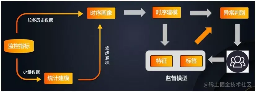 我们采用无监督学习算法,自动识别实体的数据特征,根据数据特征选取不同的算法组合,针对数据流实时建模,完成异常任务检测。并根据用户的打标信息(对告警进行确认或者误报反馈),训练监督模型,对算法进行不断优化,从而提高监控的准确率。