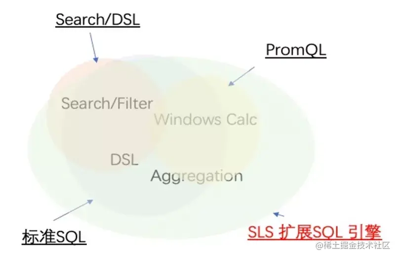 基于统一的存储,我们可以构建统一的查询和分析语法,从而一套语法适配不同的数据,并且让不同的数据之间进行联合查询也变成了可能。如下图所示,我们以标准 SQL 为基础,进行了部分 DSL 扩展和 SQL 函数扩展,并融合了 PromQL,从而让不同类型的数据查询和分析变得统一。