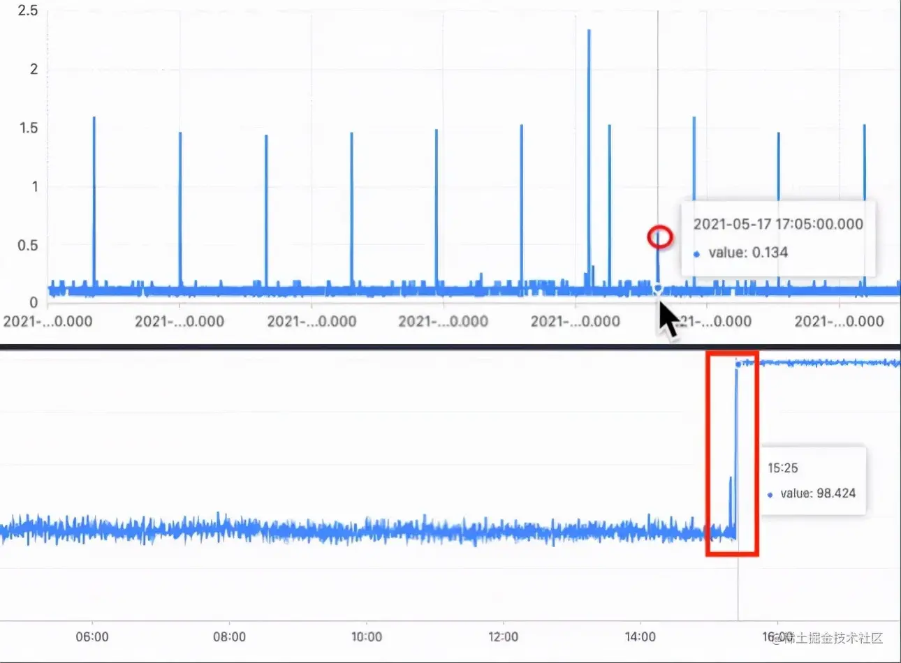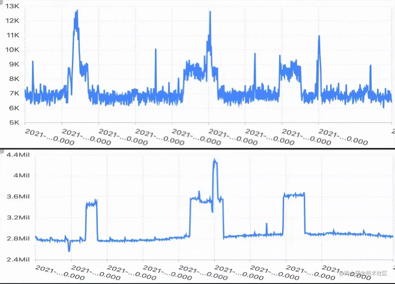 - 监控规则无法自适应:基于人为定义的阈值,很大程度上依赖于人的经验,随着系统的演化和业务的发展,这些规则往往不能很好地适应,由此不可避免地导致漏报、误报等问题。无法做到数据的自适应,因此需要人为介入,不断调整阈值。例如下图:上面是一个指标,有规则性的毛刺。如果通过阈值来判断是否需要告警,当一个毛刺点异常的时候,可能由于不满足阈值,导致告警漏报。下面是另一个指标,可能随着系统的进化,新版本发布之后,该指标的值会发生一个陡增。此时如果是固定阈值告警的话,会将陡增之后的所有数据都认为是异常点,导致告警频繁触发。此时需要人为介入去调整阈值。