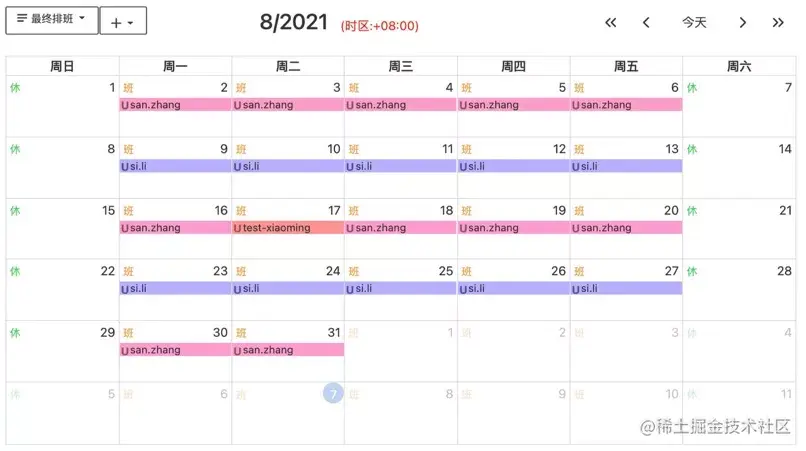 另外就是值班和代班机制。值班是非常常见的一个场景,通常情况下,告警不是发送给所有的负责人,而是通过轮转的方式进行分别值班。既然有了值班,也必须要考虑特殊的场景需要代班,例如某人值班的当天,由于有事,所以让另外一个人来代替他值班。例如下面的例子:2021年8月由张三和李四值班(每班一周,仅工作日值班),首个工作日交班;8月17日张三请假,由小明代值班。