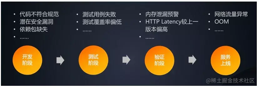 下图比较概括地描述了一个系统的质量观测完整生命周期,大体上可以分为如下四个阶段,并且在每个阶段都有需要特别关注的一些数据和指标: