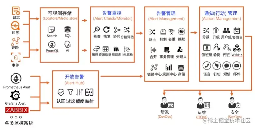 通过将日志、时序、Trace、事件等数据接入到统一的可观测存储,从而实现统一的查询分析、可视化等功能,基于此,可以实现统一的监控和告警管理,从而赋能研发、运维、安全等各个角色。除此之外,还支持通过开放告警的功能,将其它系统(例如 Prometheus、Grafana、Zabbix 等)的告警直接接入进行告警的统一管理。