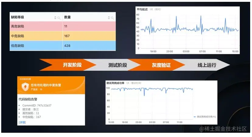 - 开发阶段:重点需要关注代码的质量,例如静态代码扫描以及依赖检查会发现潜在的代码缺陷和安全风险,由此我们可以统计千行代码缺陷率或者严重缺陷比例,从而来衡量一个系统的代码质量是否符合要求