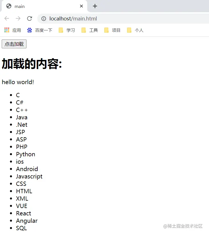 $("#content1").load("test.html")//单击时将test.html的内容加载到当前页面上