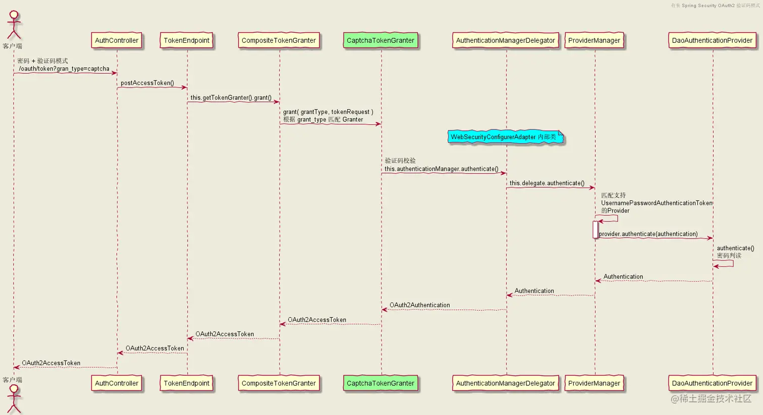 比较可知两者的区别基本就是授权者 Granter 的区别,后续的 Provider 获取用户认证信息和密码判断完全一致,具体新增的验证码模式授权者 CaptchaTokenGranter 和密码模式的授权者 ResourceOwnerPasswordTokenGraner 区别在于前者的 getOAuth2Authentication() 方法获取认证信息添加了校验验证码的逻辑,具体的代码实现在实战里交待。