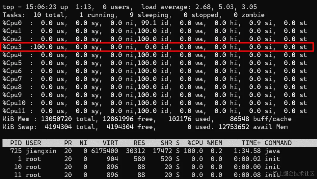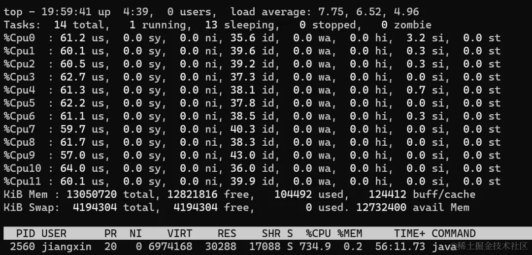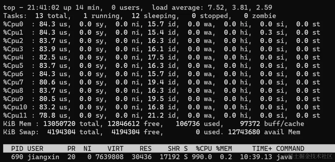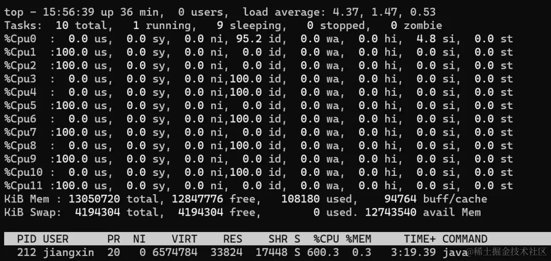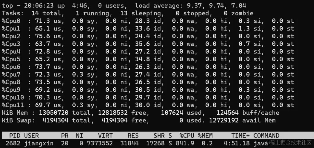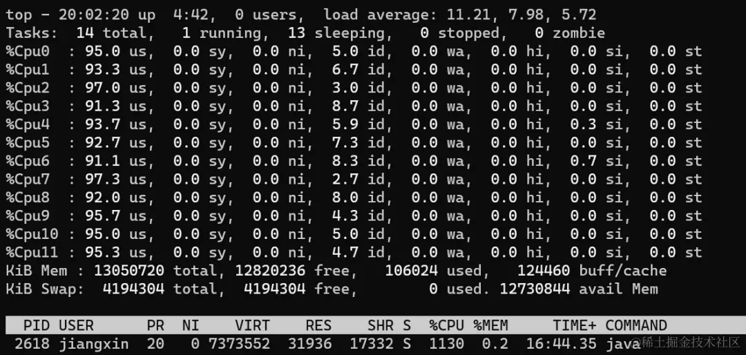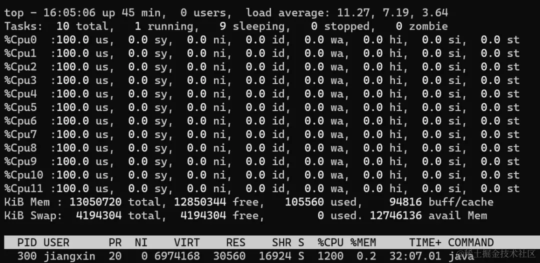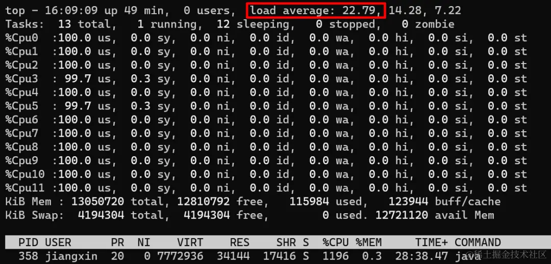 从上图可以看到,CPU利用率和上一步一样,还是所有核心100%,不过此时负载已经从11.x增加到了22.x(load average解释参考scoutapm.com/blog/unders…),说明此时CPU更繁忙,线程的任务无法及时执行。