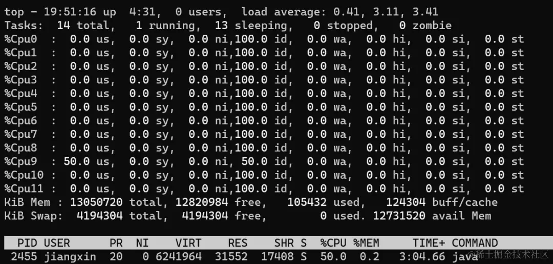 哇,唯一有利用率的9号核心,利用率也才50%,和前面没有sleep的100%相比,已经低了一半了。现在把线程数调整到12个看看: