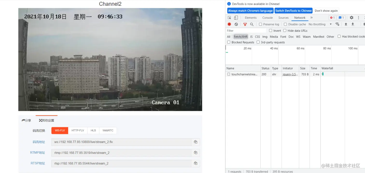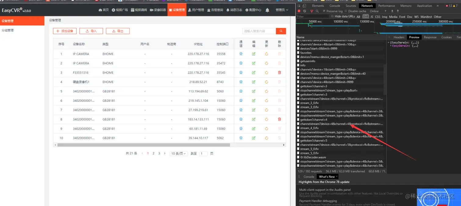 首先最简单的方法是在EasyNVR视频播放页面F12可以查看到当前播放的信息,页面选择网络后点击XNR,页面中短暂等待可以获取到箭头所示位置。