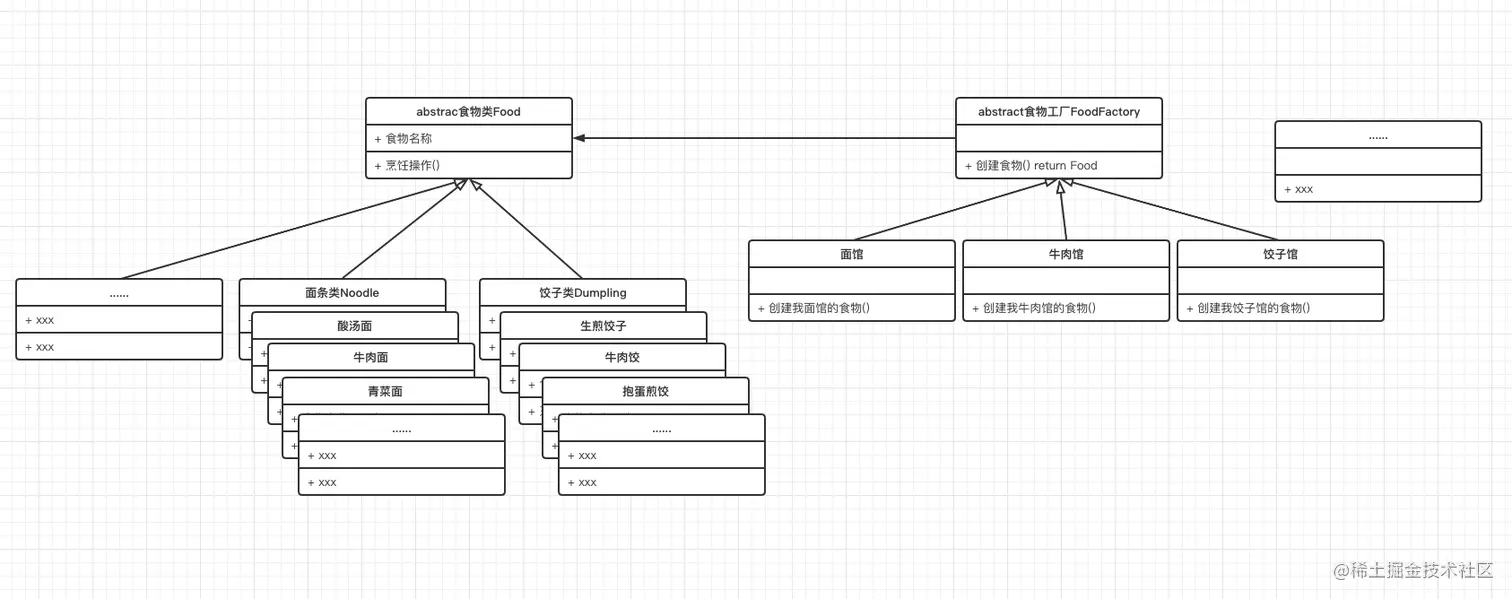 那么如上有三个具体类(三明治、面条、饺子)。这里画个图: